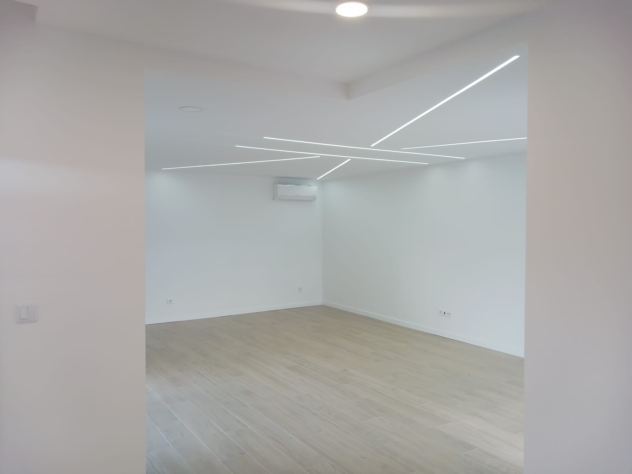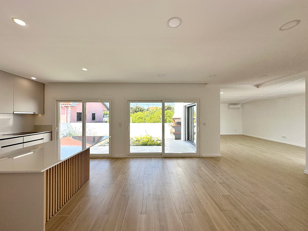 Ao Entrar… É recebido por um bonito jardim e um hall de entrada com roupeiro embutido e painel ripado em madeira com LEDs embutidos. A moradia desenvolve-se em open space, com uma espaçosa sala e cozinha moderna com ilha, totalmente equipada com eletrodomésticos Candy, e vista direta para o jardim exterior, barbecue com lavatório e zona de lazer.