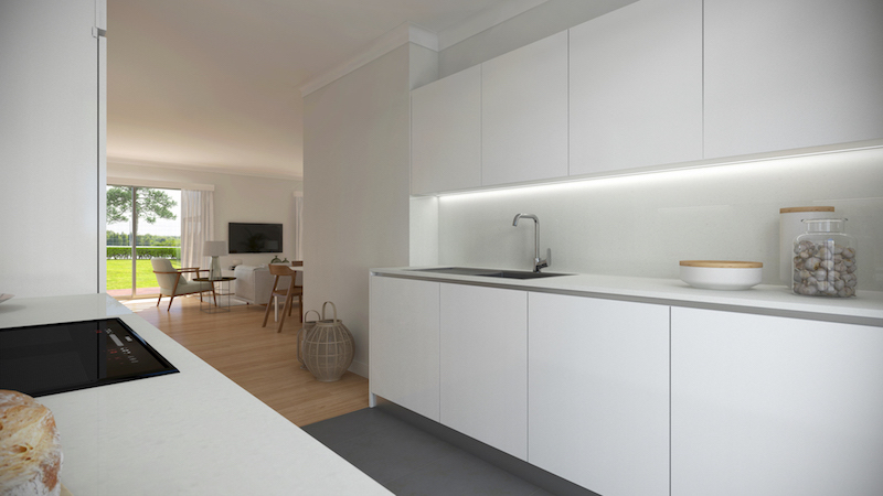 – Cozinha em madeira lacada branco-mate, equipada com forno eléctrico, placa vitrocerâmica, bancada em granito e lava-loiças em inox.