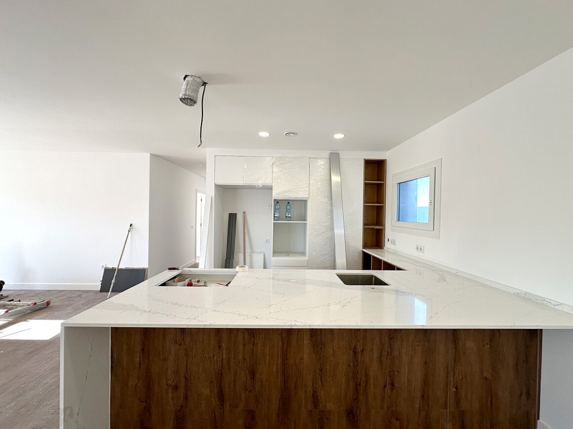 A cozinha totalmente equipada, com península em silestone e eletrodomésticos encastrados (placa de indução, forno, exaustor, micro-ondas, máquinas de lavar roupa e louça), alia design e funcionalidade, criando o espaço ideal para quem valoriza o prazer de cozinhar e receber.
