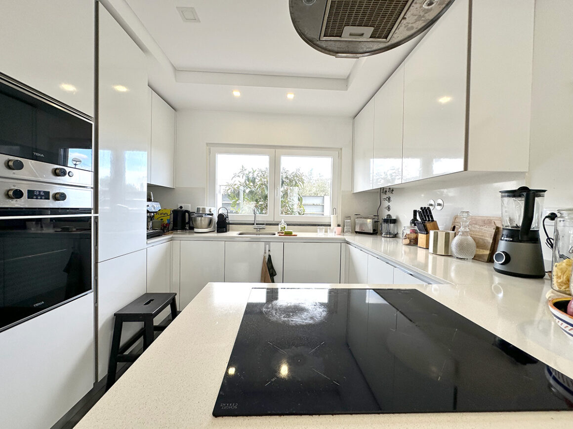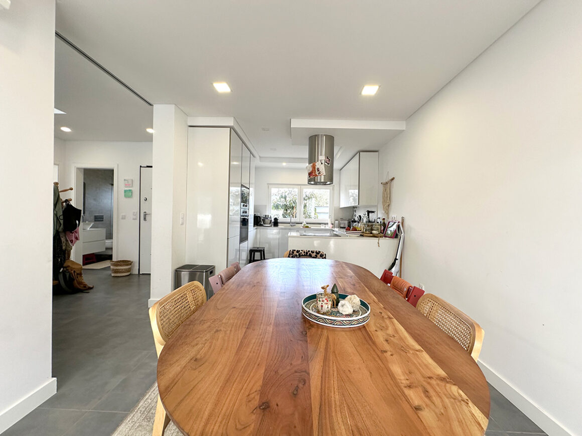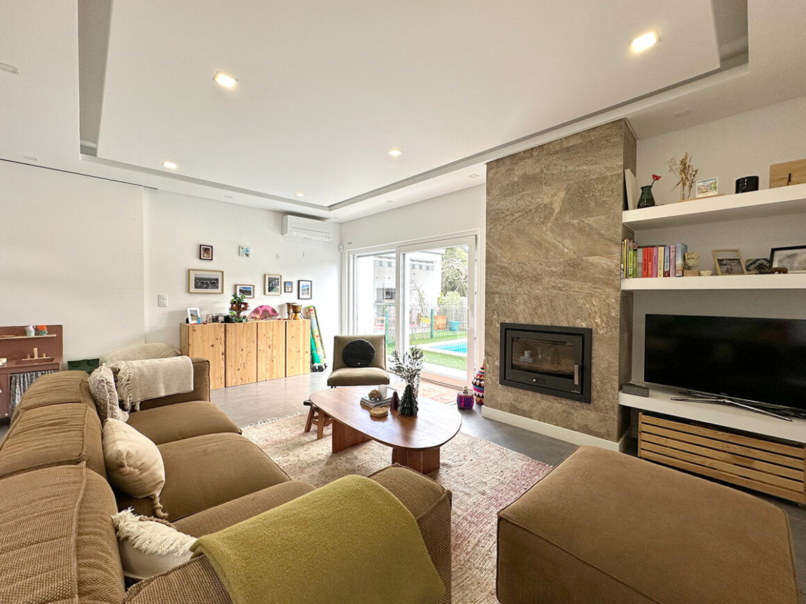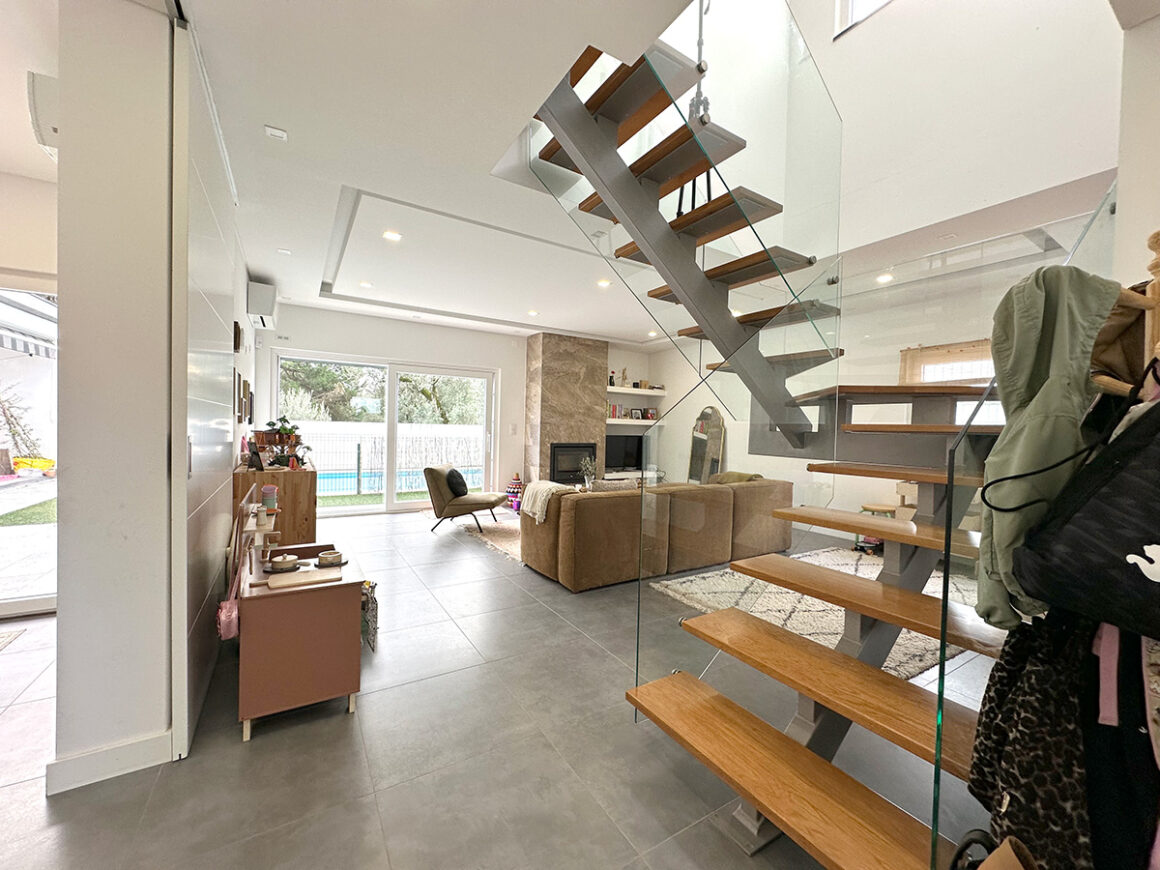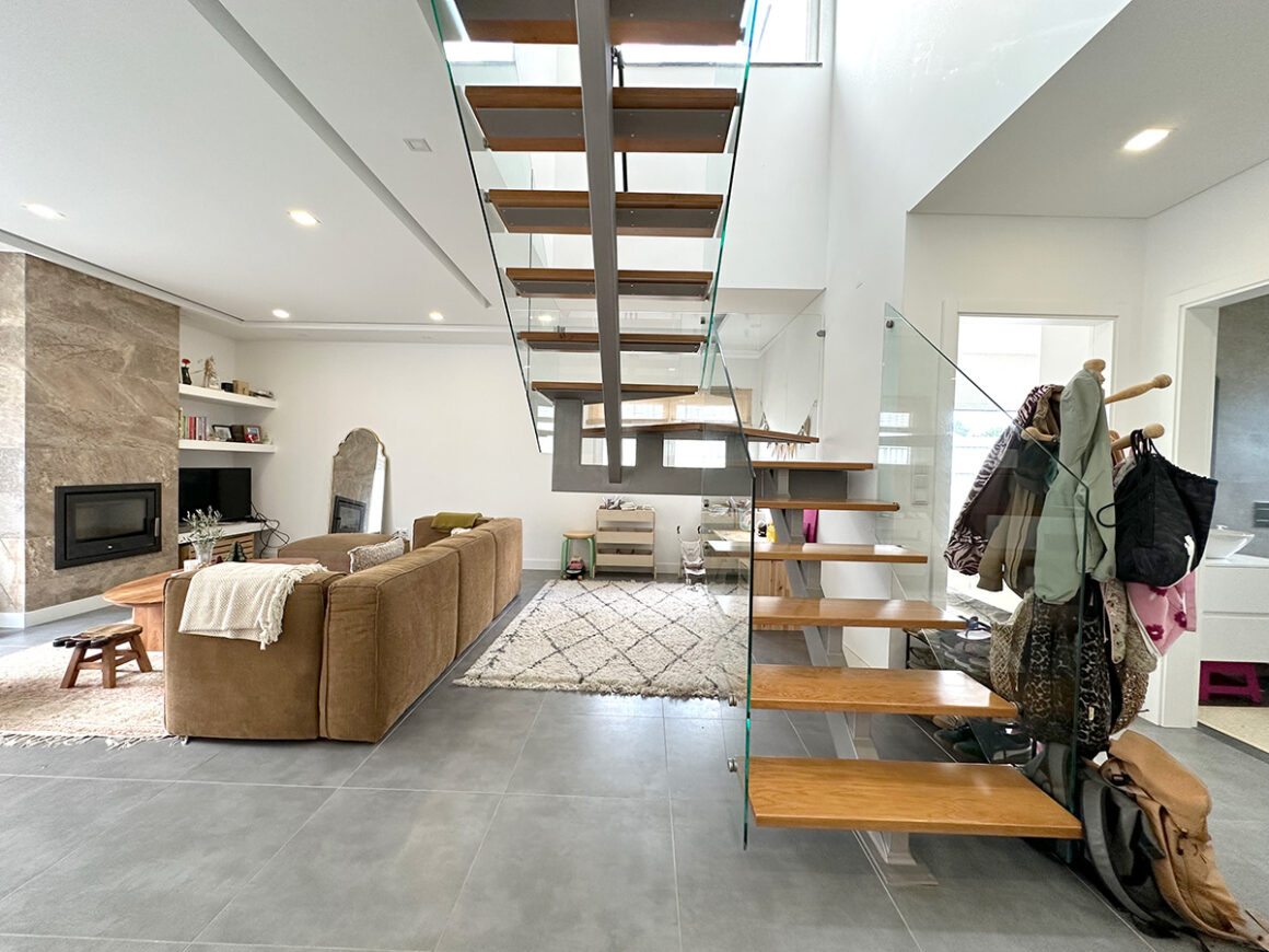 Distribuída em dois pisos, a casa foi pensada para oferecer conforto e privacidade. No rés-do-chão, encontra-se uma cozinha totalmente equipada, organizada em espaço com uma sala de jantar, separado da sala de estar, o que cria uma divisão prática e acolhedora para o convívio diário. Cada divisão dispõe de ar condicionado, proporcionando uma climatização confortável durante todo o ano, e a casa conta também com lareira, aspiração central e sistema de vídeo porteiro para maior segurança.