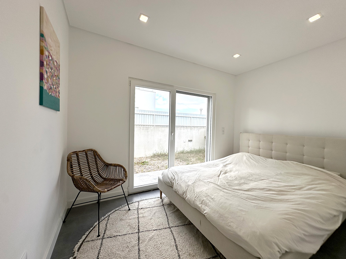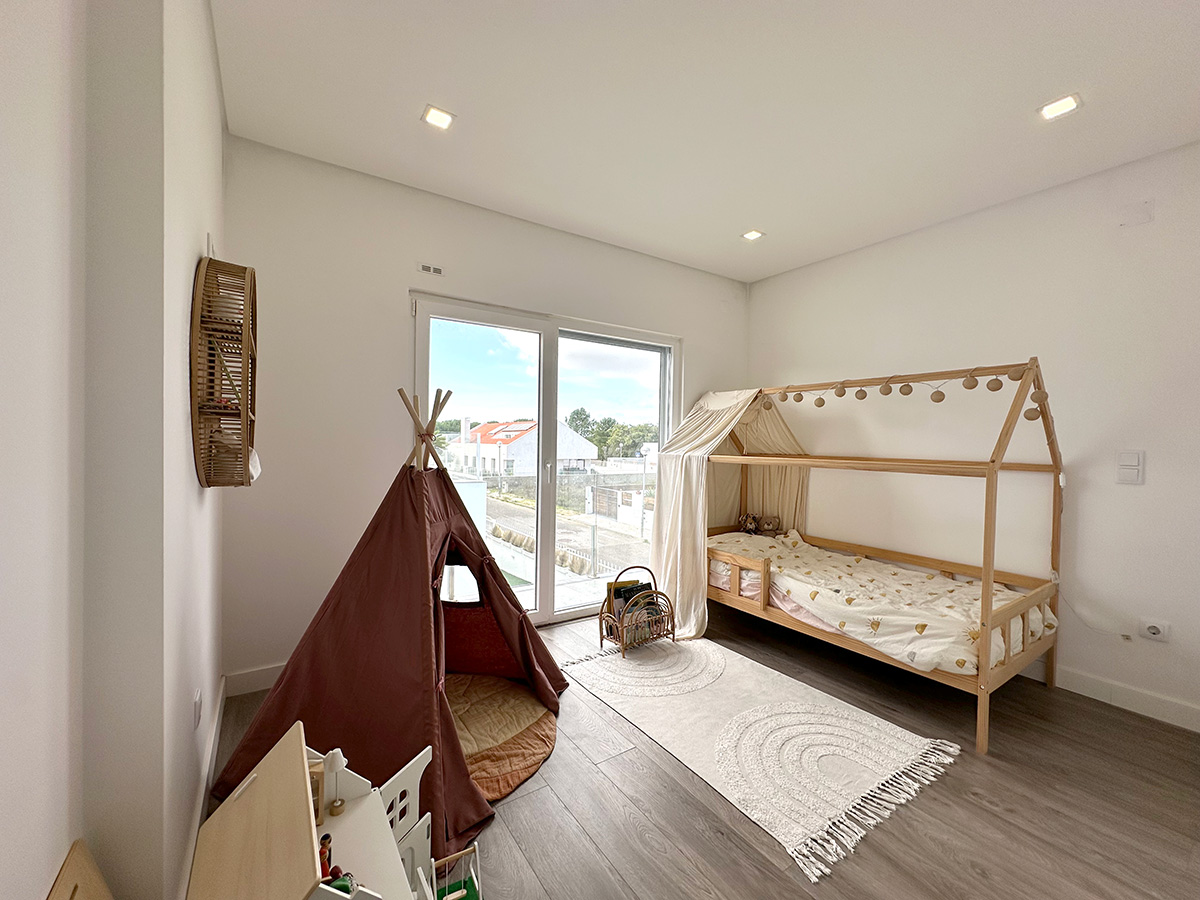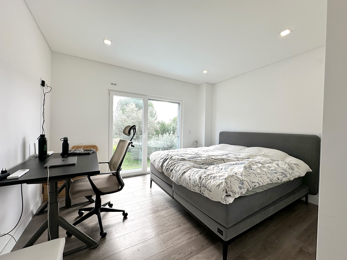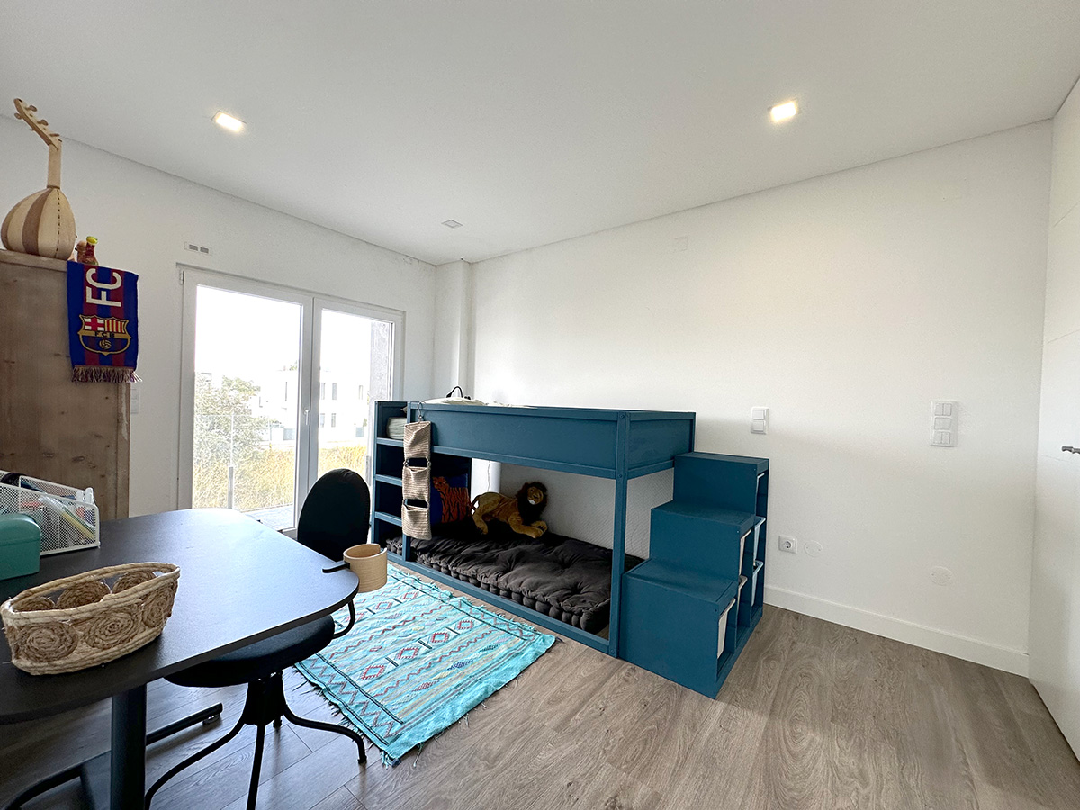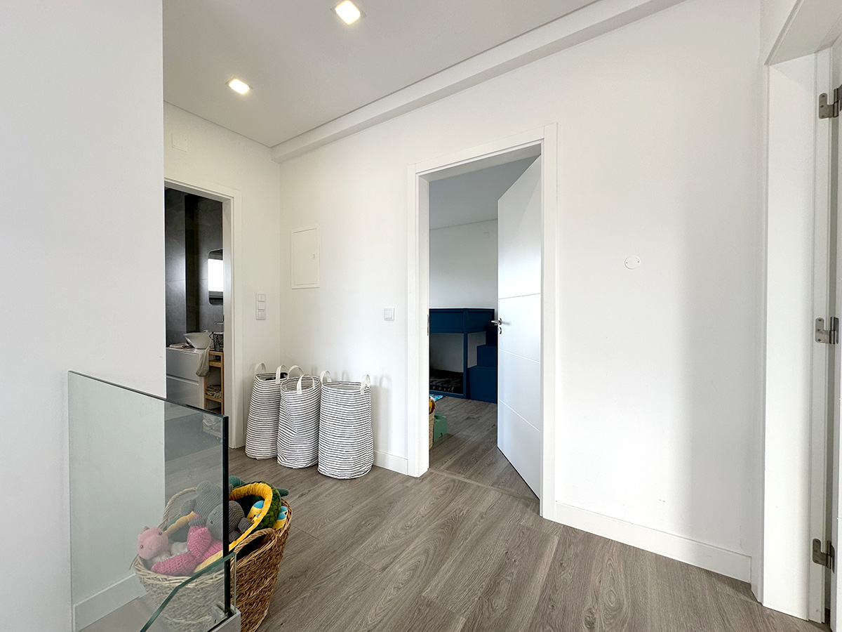 A área privada é composta por 4 quartos com roupeiros embutidos, distribuídos pelos dois pisos. No rés-do-chão, existe um quarto com acesso a uma casa de banho completa, ideal para visitas ou para maior comodidade familiar. No primeiro piso, encontram-se dois quartos adicionais com casa de banho de apoio e uma suite completa, proporcionando um espaço mais reservado e independente. A garagem completa a oferta de comodidade, com espaço para estacionamento ou arrumação adicional.
