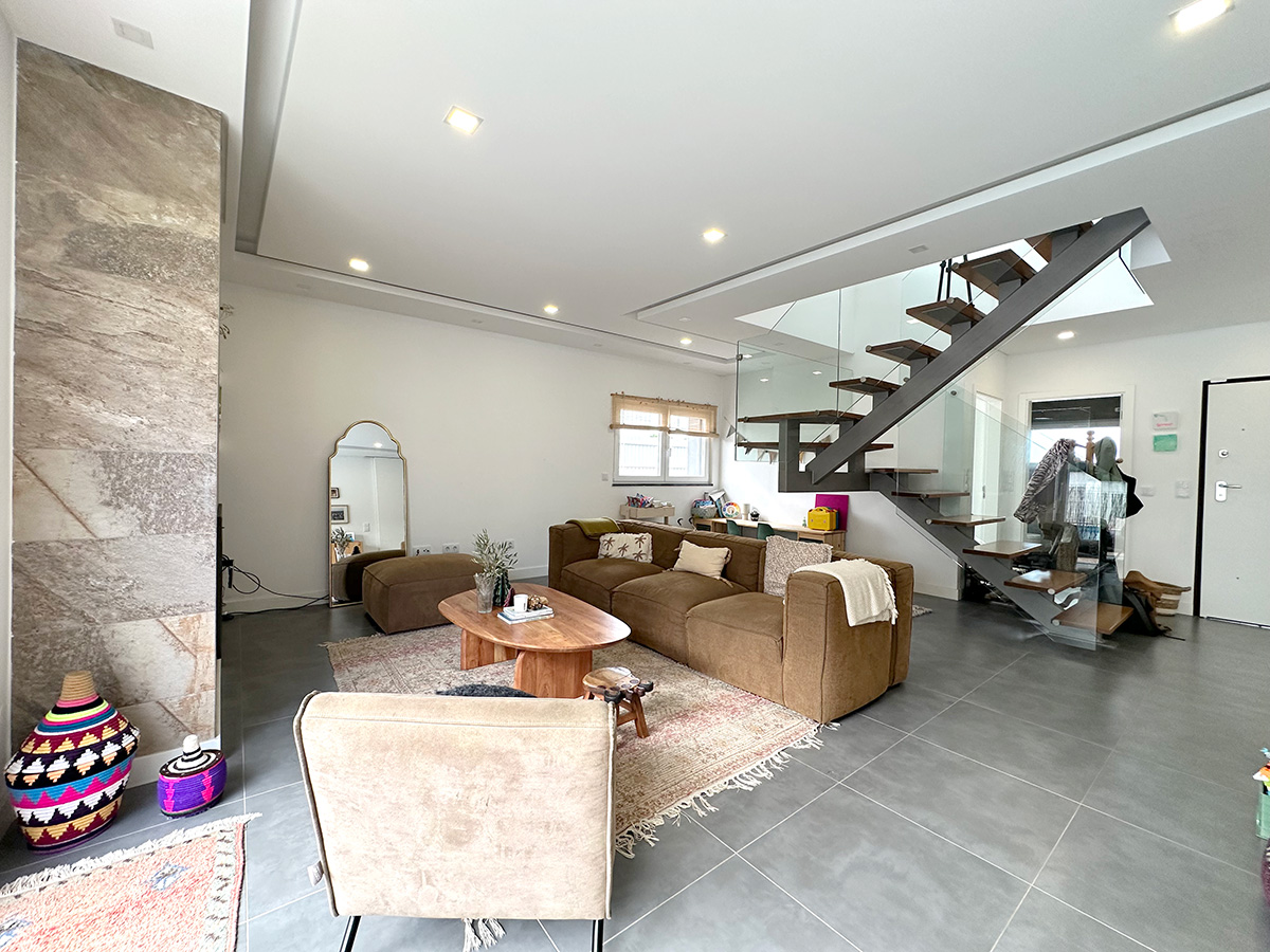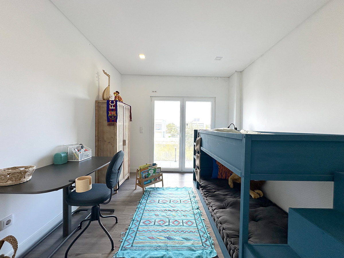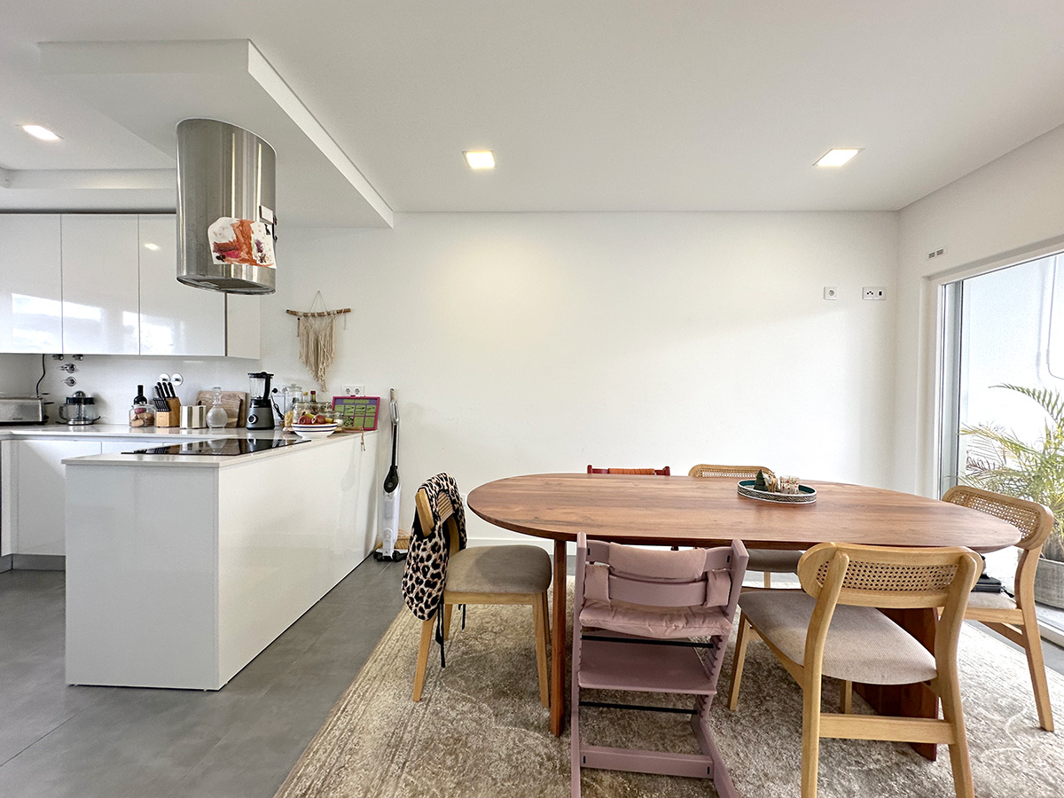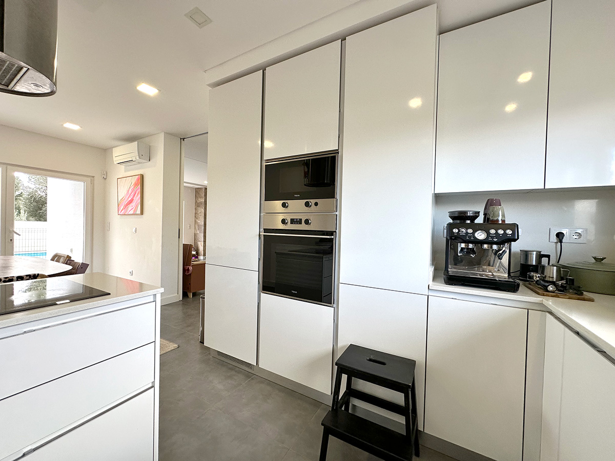 Distribuída em dois pisos, a casa foi pensada para oferecer conforto e privacidade. No rés-do-chão, encontra-se uma cozinha totalmente equipada, organizada em espaço com uma sala de jantar, separado da sala de estar, o que cria uma divisão prática e acolhedora para o convívio diário. Cada divisão dispõe de ar condicionado, proporcionando uma climatização confortável durante todo o ano, e a casa conta também com lareira, aspiração central e sistema de vídeo porteiro para maior segurança.