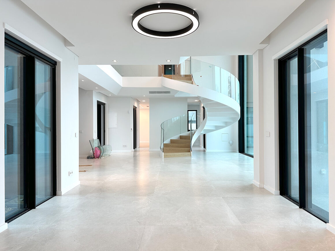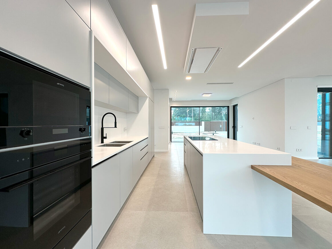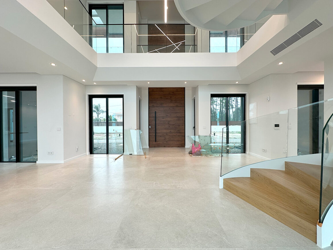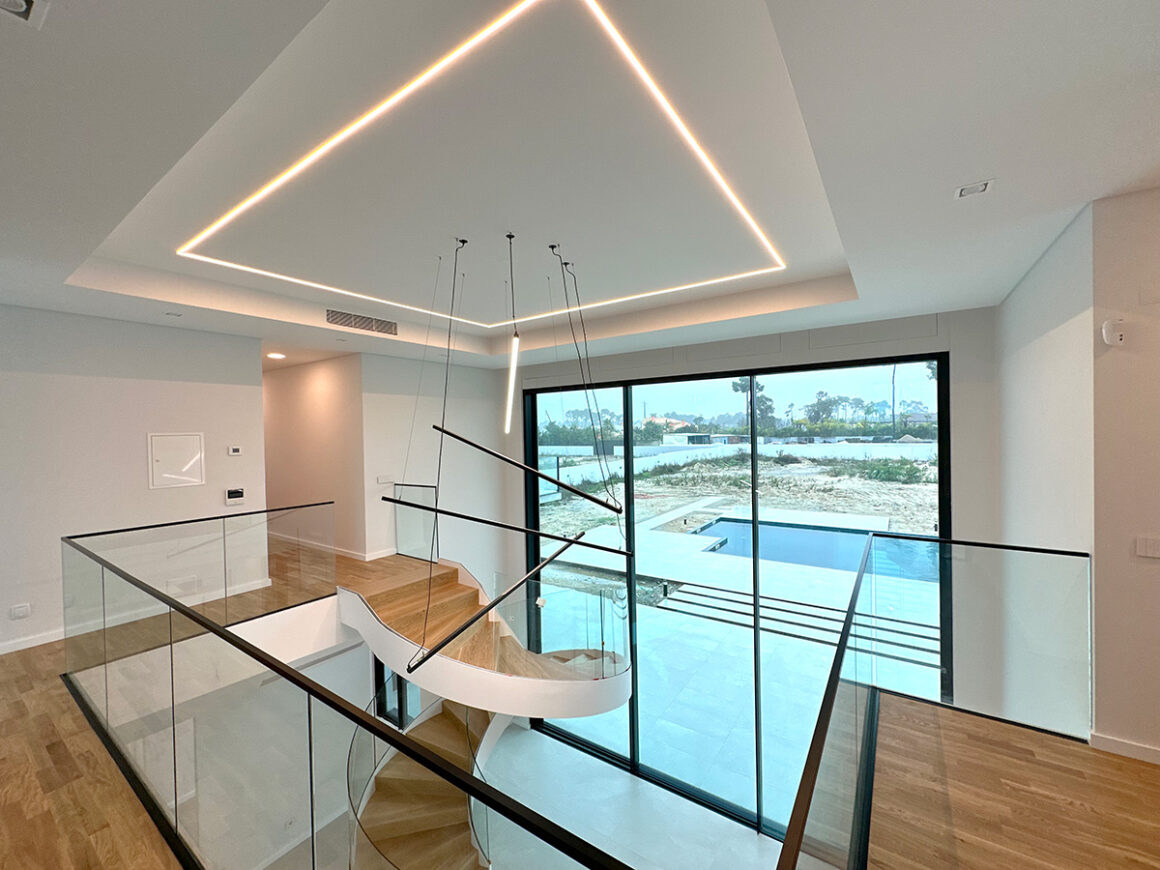 Ao cruzar a entrada principal, será recebido por uma magnífica sala de estar com pé-direito duplo, emoldurada por uma escadaria em espiral de design exclusivo, que confere um toque de distinção à propriedade. A zona social é ampla e luminosa, com uma sala de jantar e cozinha integradas em conceito “open space”, concebidas para criar um ambiente acolhedor e convidativo. Além da cozinha principal, dispõe ainda de uma copa, uma sala familiar, uma lavandaria e uma despensa, oferecendo todo o conforto para o seu dia-a-dia.