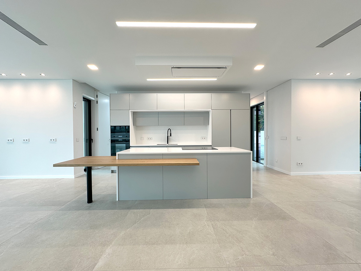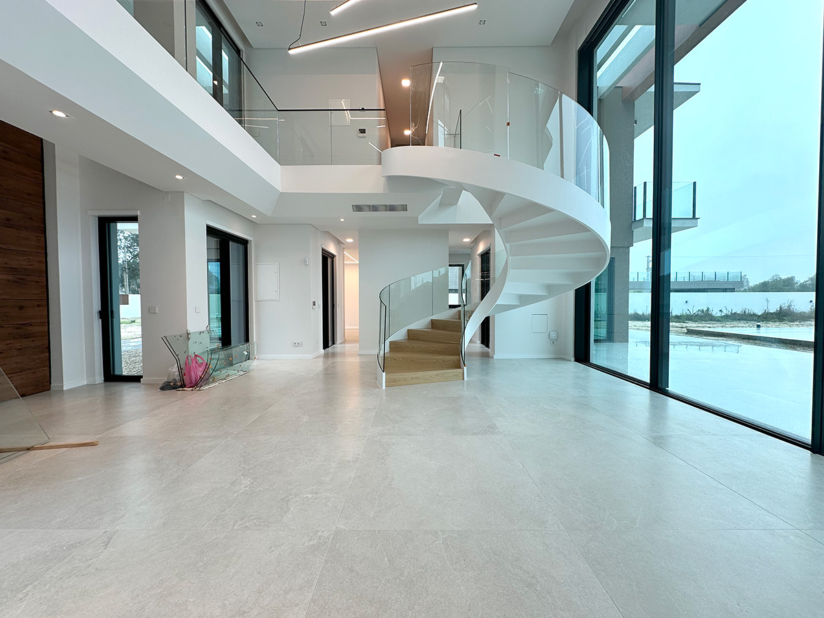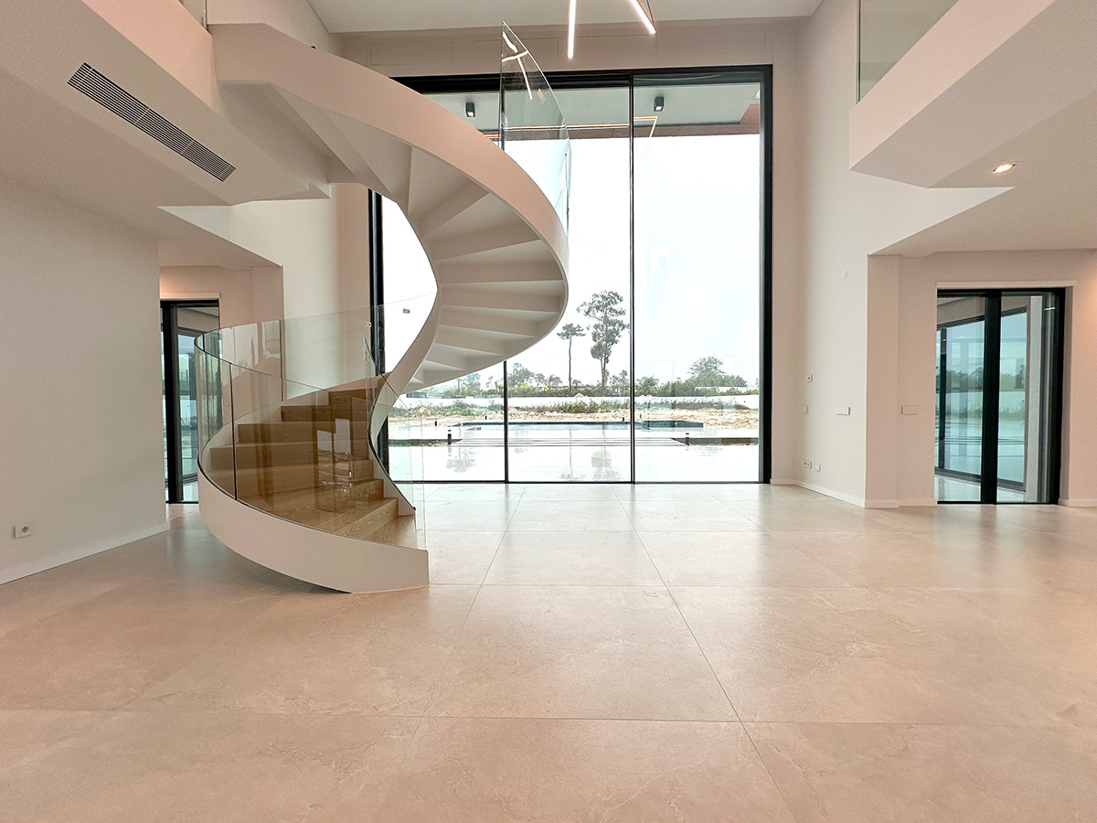 Ao cruzar a entrada principal, será recebido por uma magnífica sala de estar com pé-direito duplo, emoldurada por uma escadaria em espiral de design exclusivo, que confere um toque de distinção à propriedade. A zona social é ampla e luminosa, com uma sala de jantar e cozinha integradas em conceito “open space”, concebidas para criar um ambiente acolhedor e convidativo. Além da cozinha principal, dispõe ainda de uma copa, uma sala familiar, uma lavandaria e uma despensa, oferecendo todo o conforto para o seu dia-a-dia.
