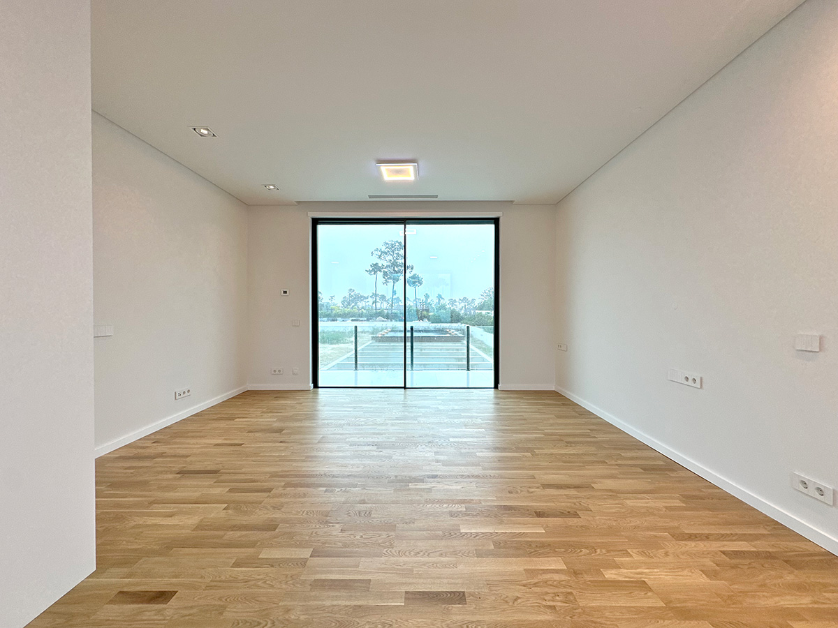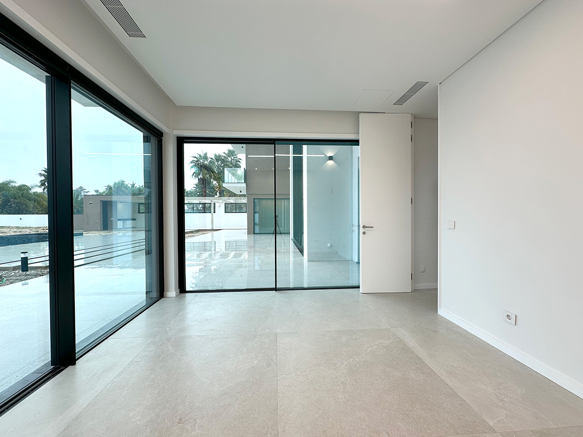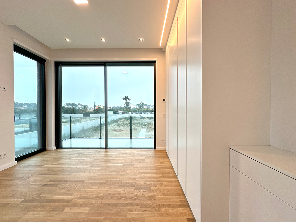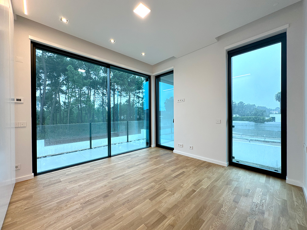 No piso superior, cinco generosas suítes, todas com varandas privadas e vistas para a envolvência verde, garantem um retiro pessoal de conforto e tranquilidade. A Master Suite destaca-se pelo seu espaçoso walk-in closet, uma área de estar privativa e uma varanda ampla, ideal para momentos de contemplação. Os materiais nobres e acabamentos de alta qualidade estão presentes em todos os espaços, sublinhando o compromisso com a excelência. Tudo integrado no conceito casa inteligente, controlado através de aplicação e acionado de qualquer lugar do planeta.