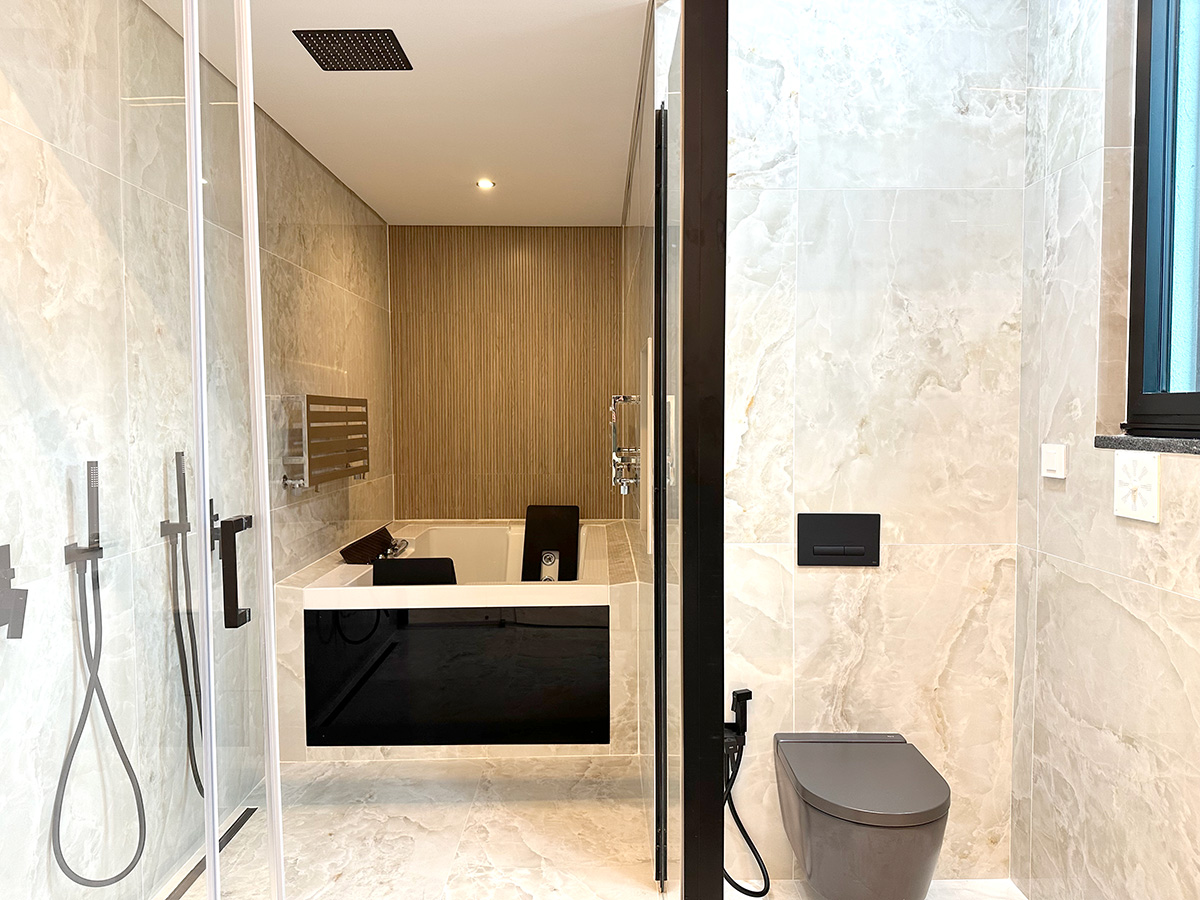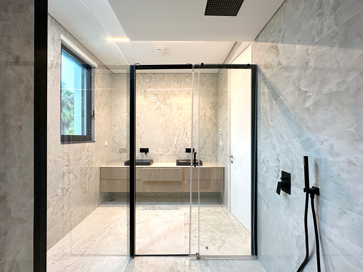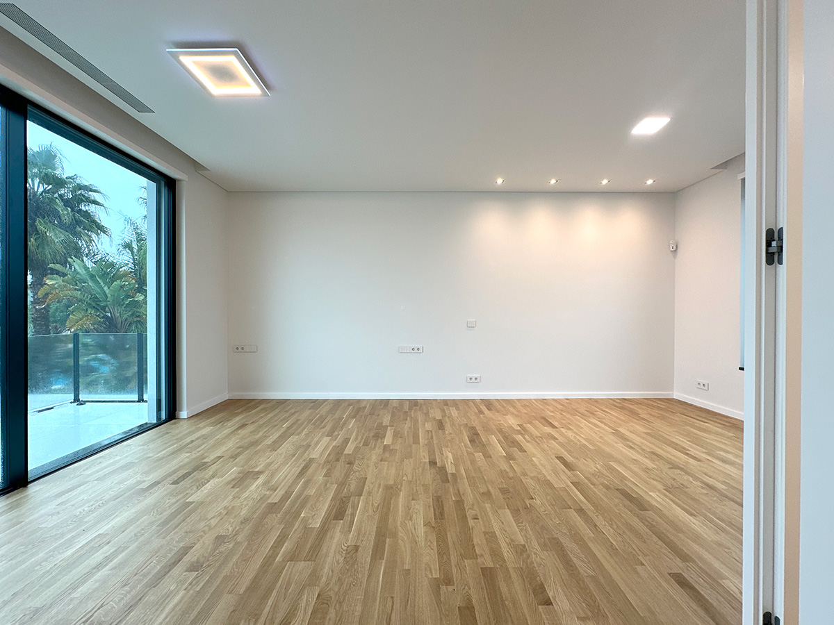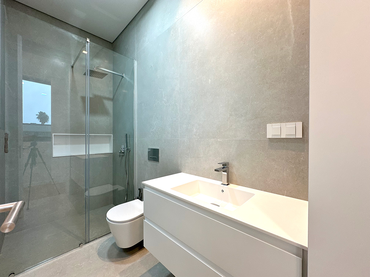 No piso superior, cinco generosas suítes, todas com varandas privadas e vistas para a envolvência verde, garantem um retiro pessoal de conforto e tranquilidade. A Master Suite destaca-se pelo seu espaçoso walk-in closet, uma área de estar privativa e uma varanda ampla, ideal para momentos de contemplação. Os materiais nobres e acabamentos de alta qualidade estão presentes em todos os espaços, sublinhando o compromisso com a excelência. Tudo integrado no conceito casa inteligente, controlado através de aplicação e acionado de qualquer lugar do planeta.