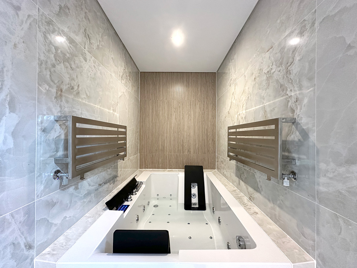 Sistema de arrefecimento da casa é feito através de ventilo convectores no verão e o aquecimento no inverno com o apoio de piso radiante hidráulico mantendo toda a casa em temperatura agradável o ano todo com baixo consumo energético.