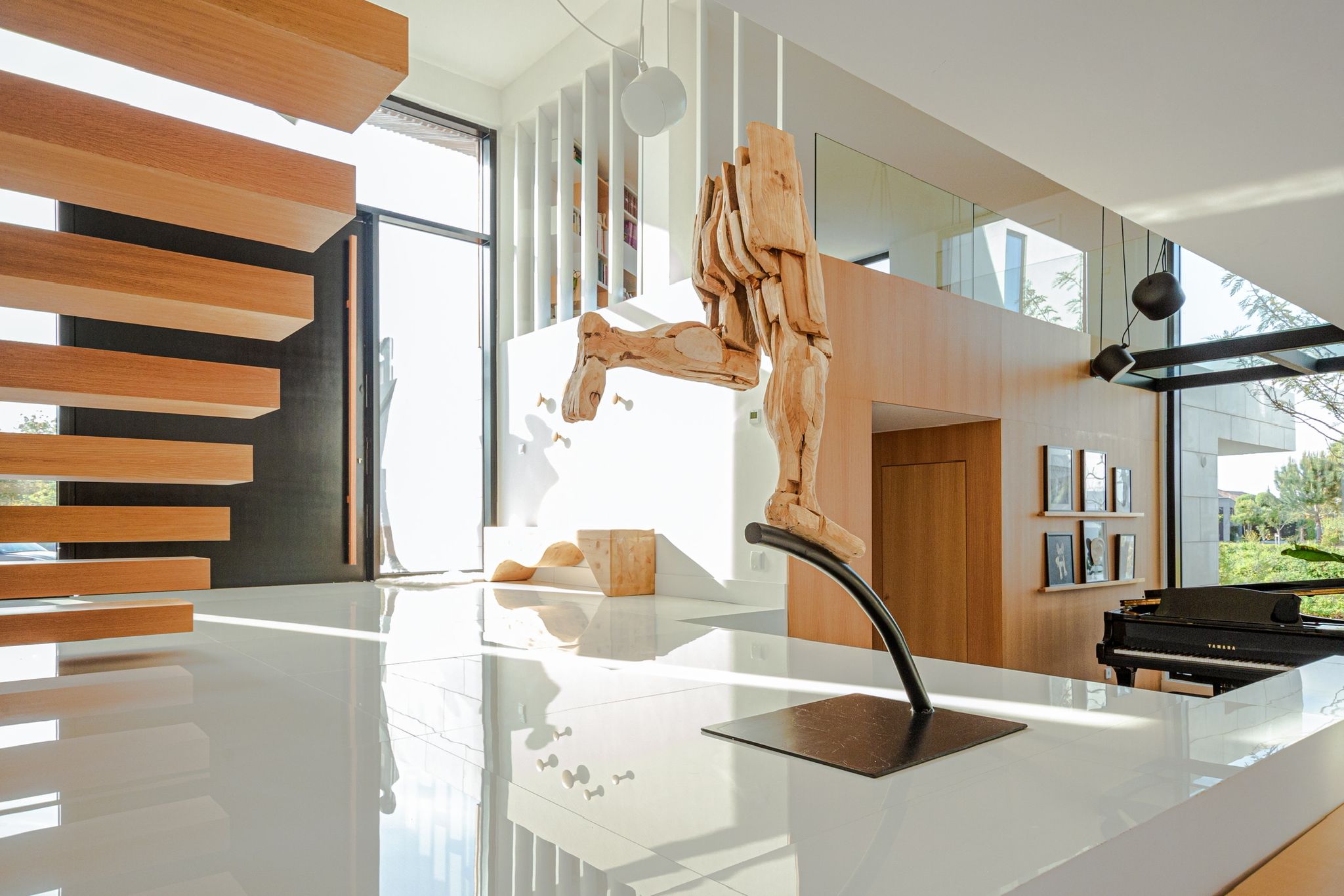 A moradia conta com piso radiante em todas as divisões, incluindo cave e sala de jogos, e sistema de domótica. Entre os materiais utilizados destacam-se os ripados em madeira de câmbala iroco, pavimentos em carvalho rústico e casas de banho com acabamentos em xisto, madeira e betão afagado.
