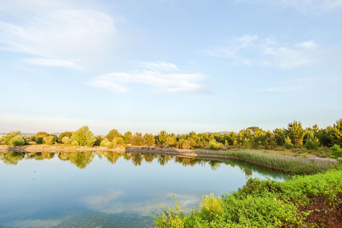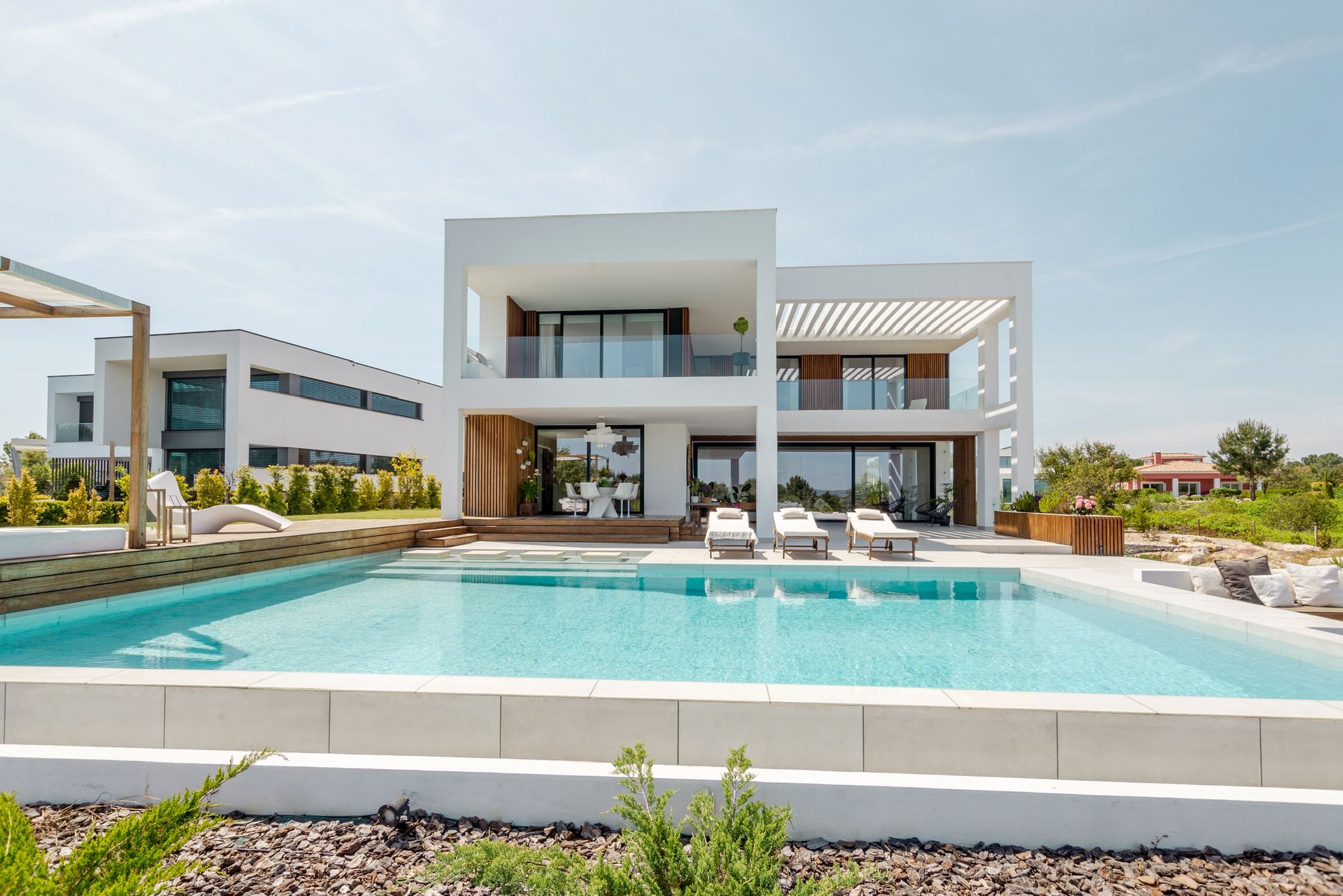 A zona exterior está equipada com piscina infinita, ladeada por um fogo de chão, uma lareira de etanol exterior e áreas ajardinadas com vista desafogada para o lago. No interior, destaca-se ainda uma lareira suspensa na sala e outra lareira de etanol na suite principal.