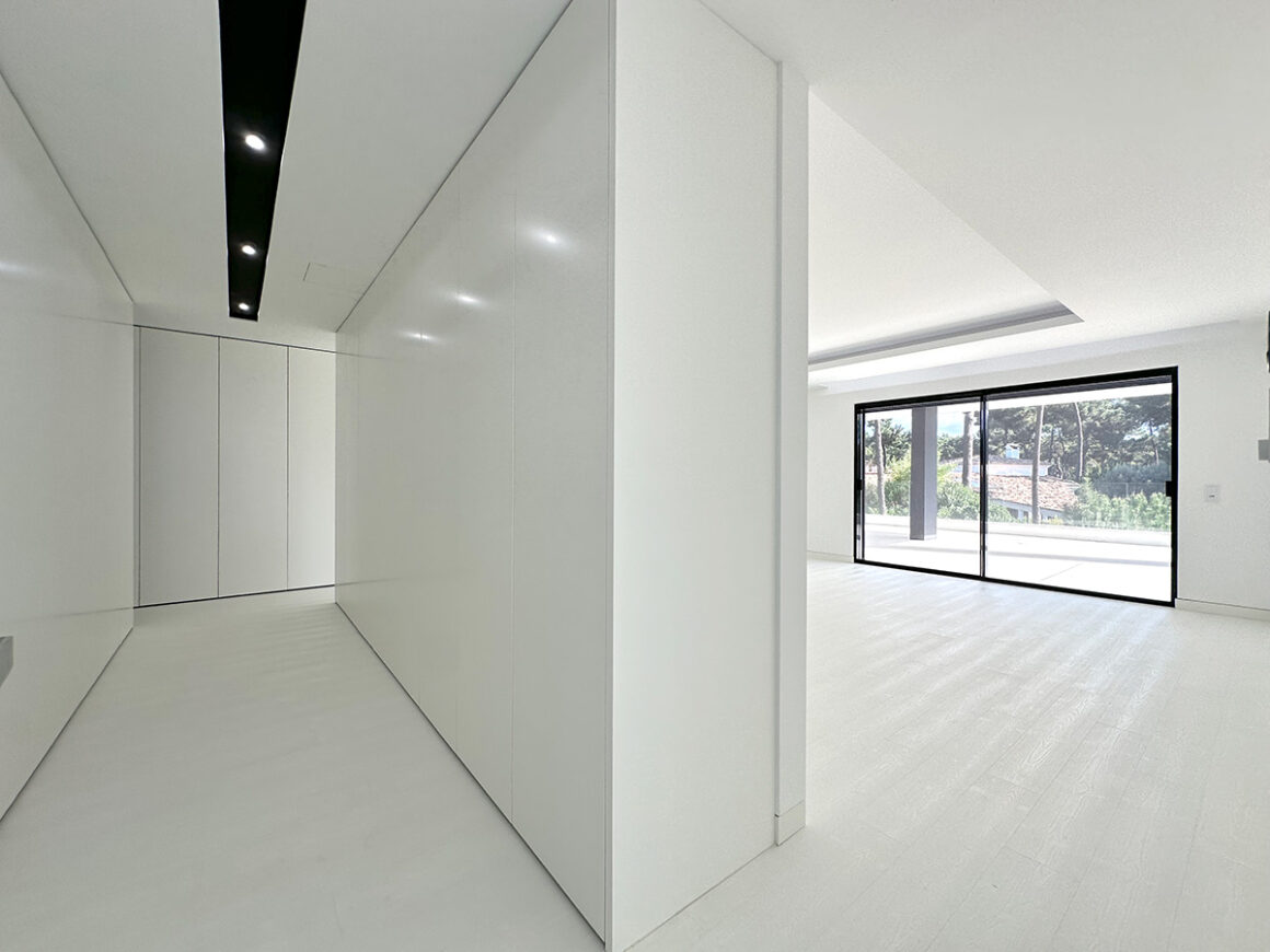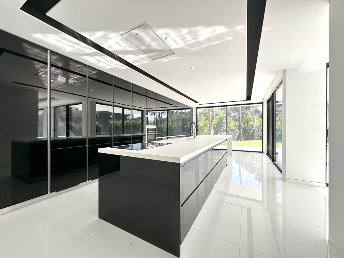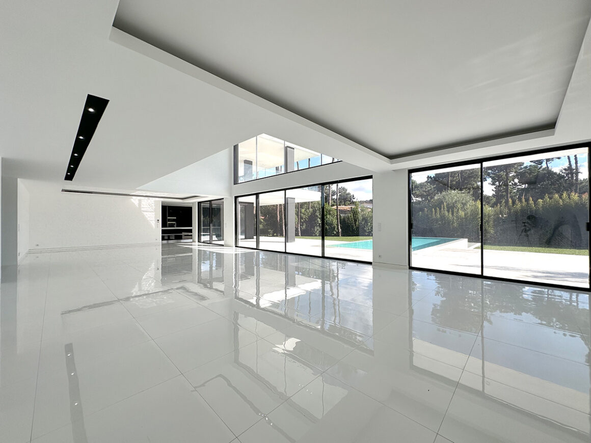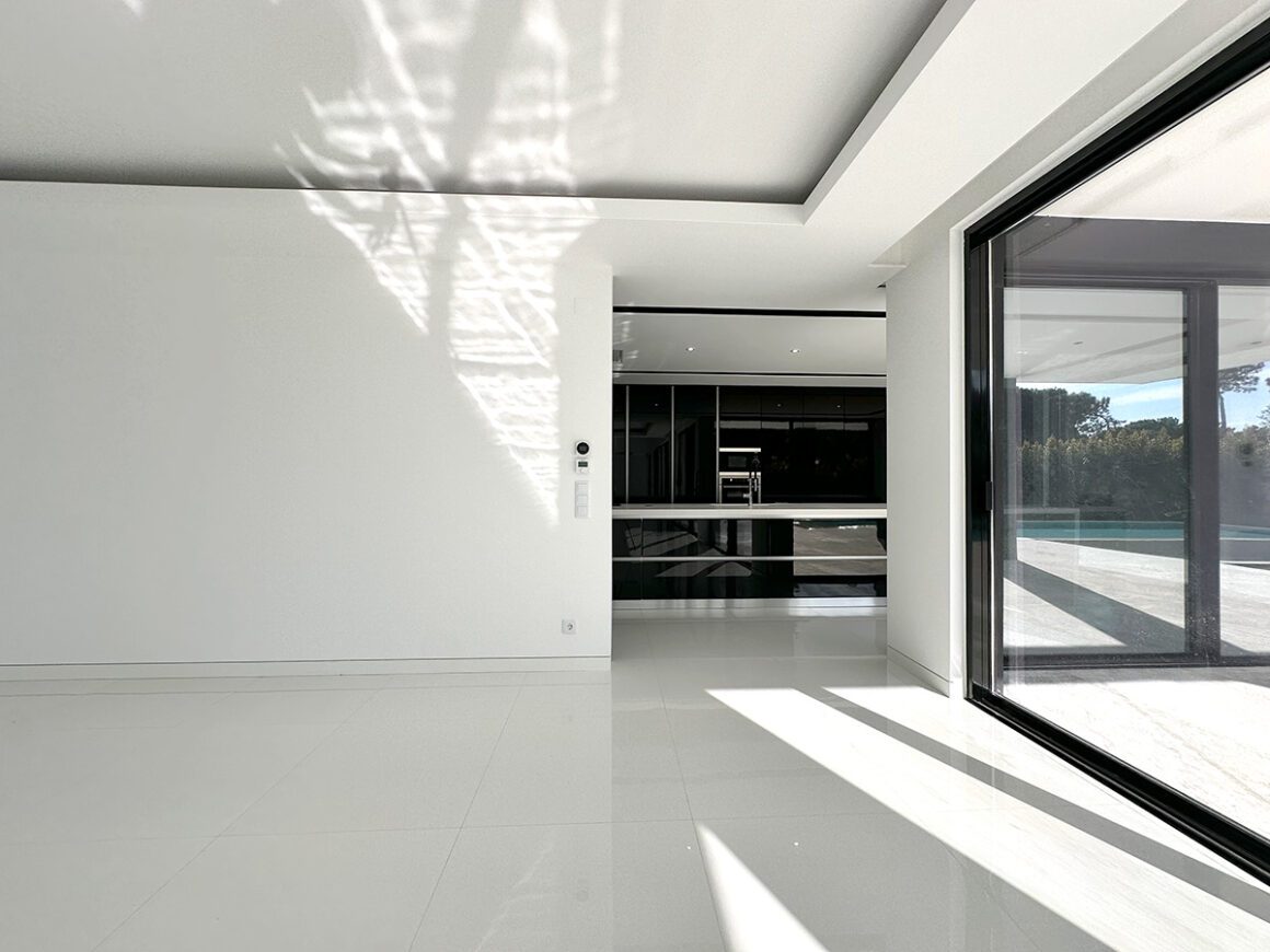A sala principal, com cerca de 100 m², foi pensada como o centro social da casa, com amplas janelas que promovem luz natural e ligação ao exterior. A cozinha, equipada com eletrodomésticos de última geração e quatro frigoríficos combinados, apresenta um layout funcional e contemporâneo.