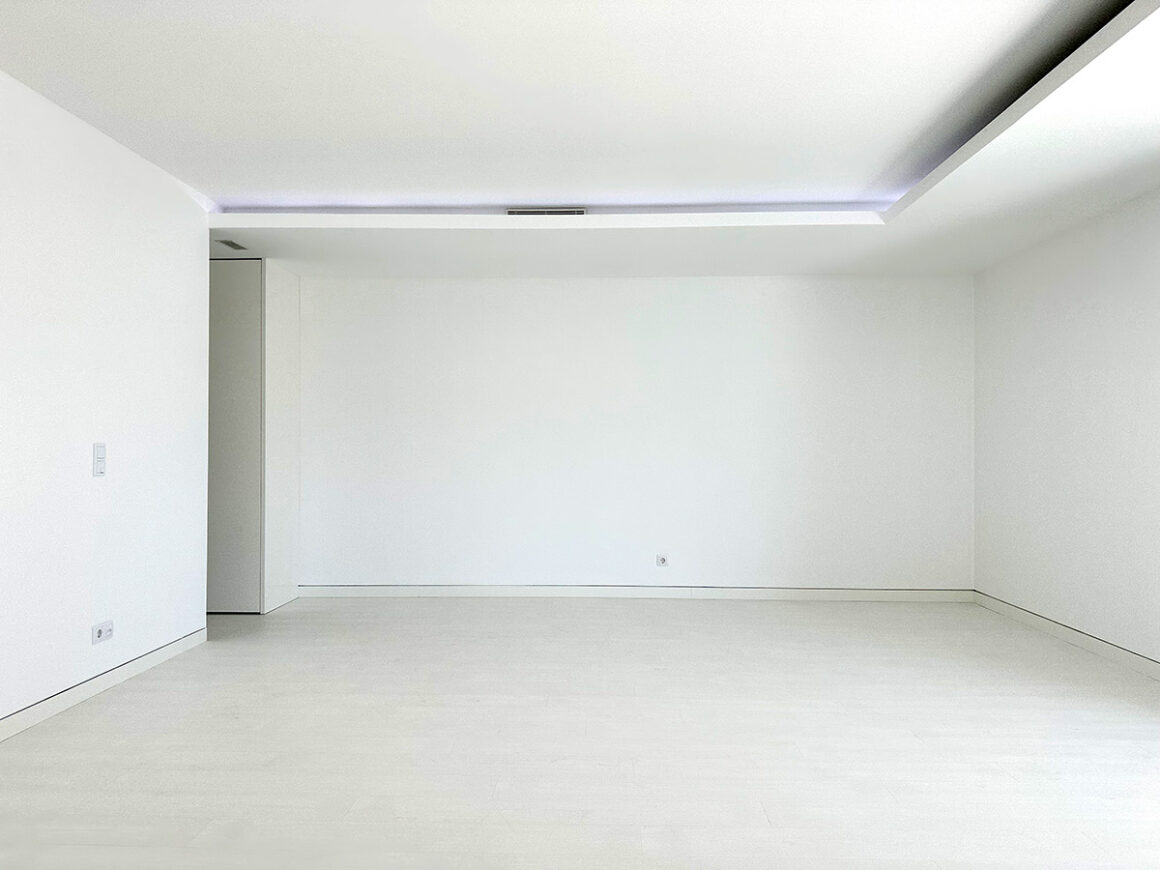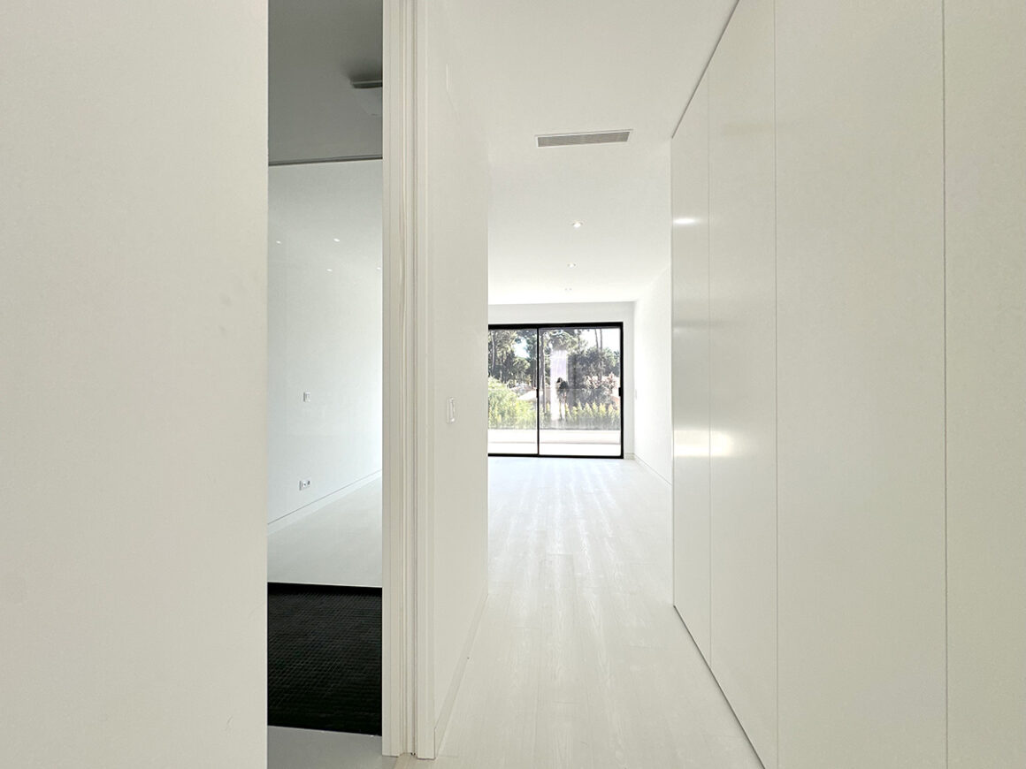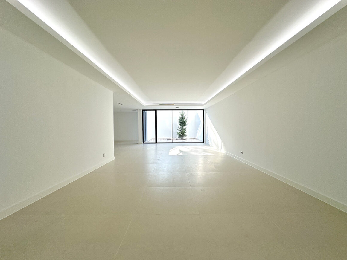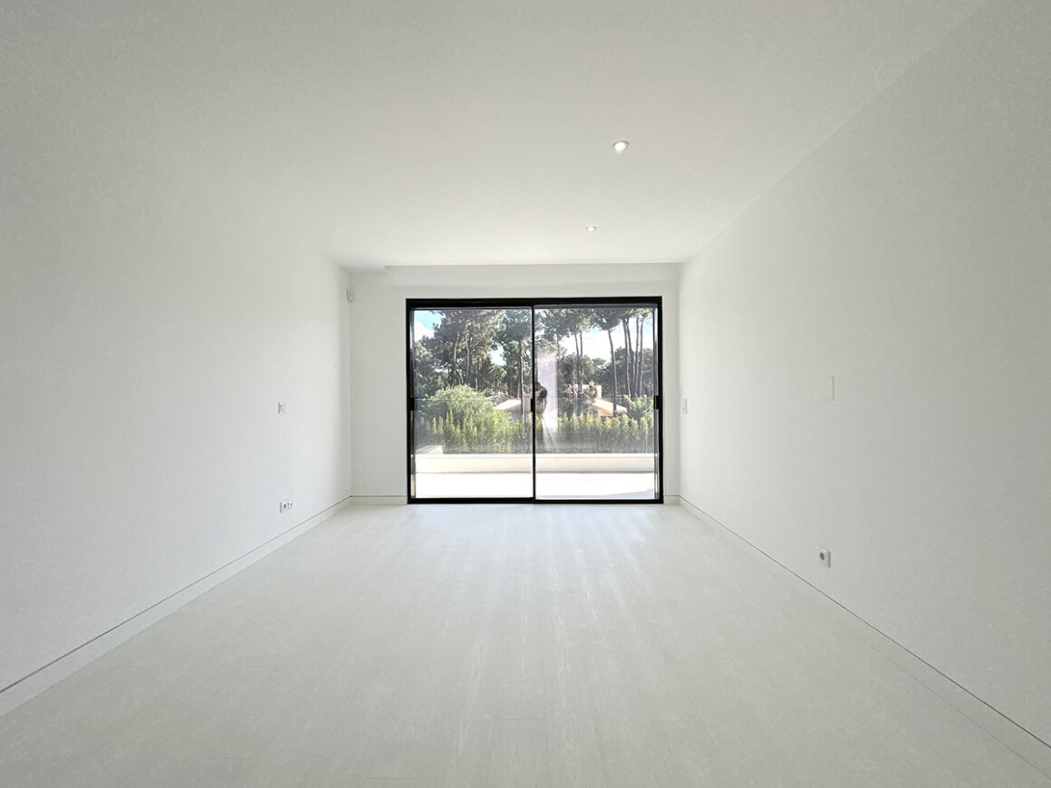 A sala principal, com cerca de 100 m², foi pensada como o centro social da casa, com amplas janelas que promovem luz natural e ligação ao exterior. A cozinha, equipada com eletrodomésticos de última geração e quatro frigoríficos combinados, apresenta um layout funcional e contemporâneo.