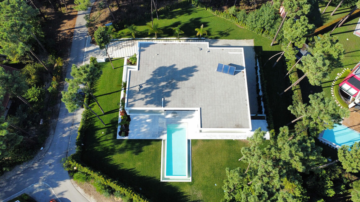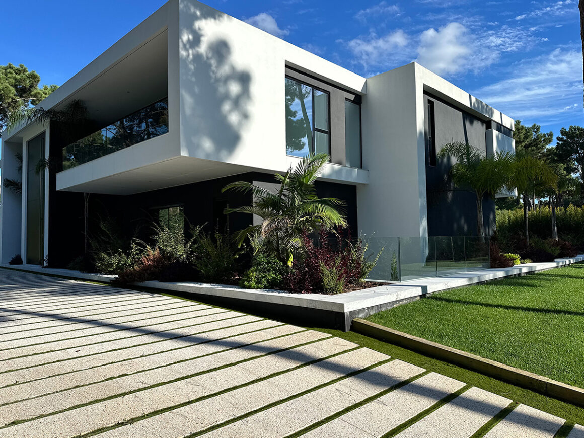O espaço exterior foi projetado para maximizar o conforto e o lazer. A piscina infinita cria continuidade visual com o jardim e proporciona um ambiente tranquilo. O terreno plano permite múltiplas zonas de descanso, convívio e refeição ao ar livre.