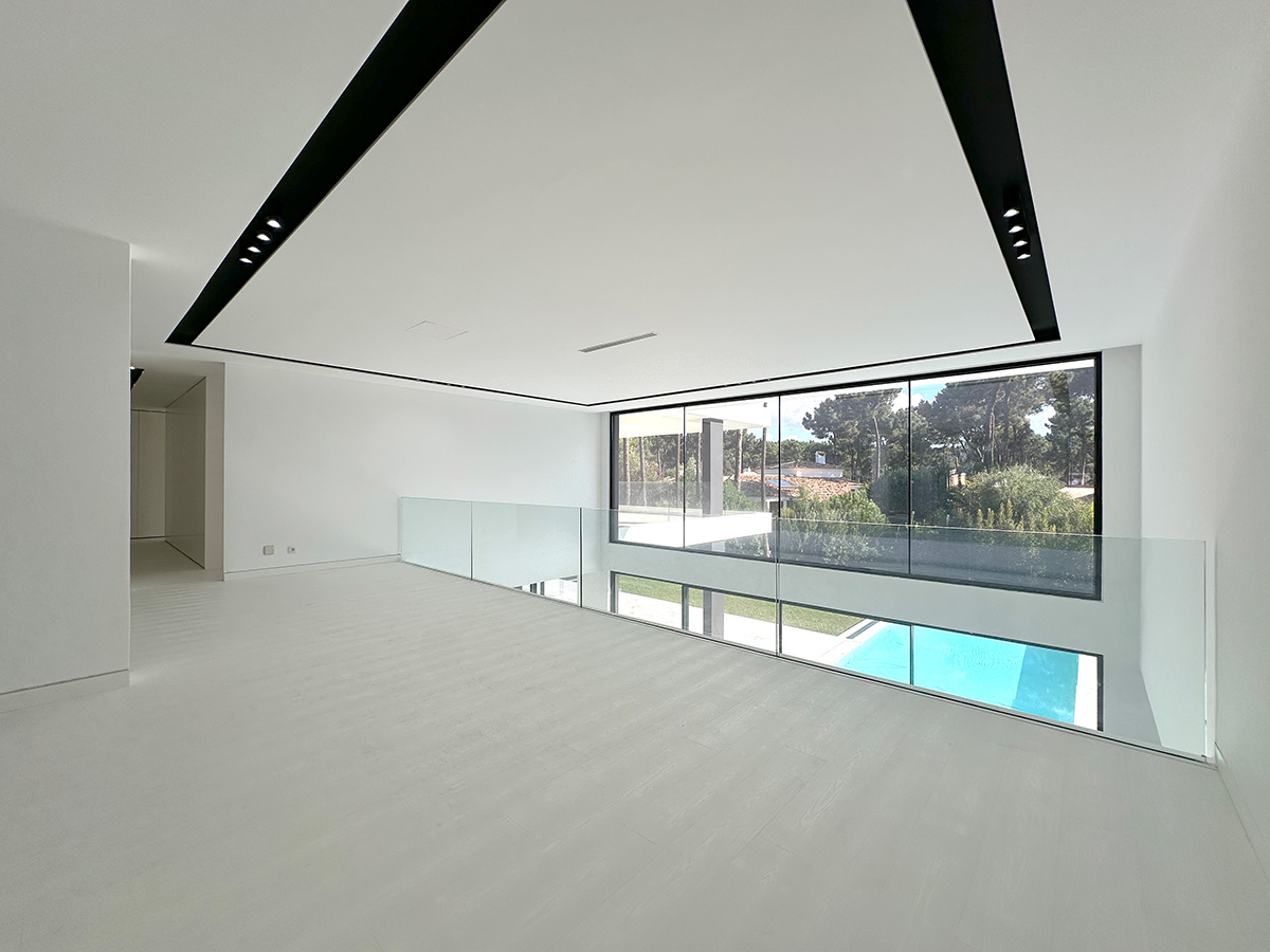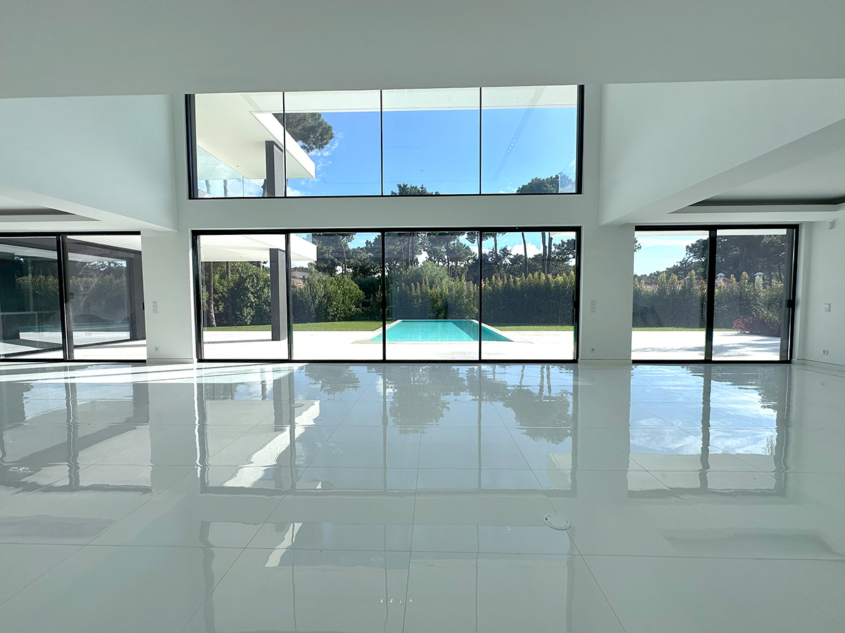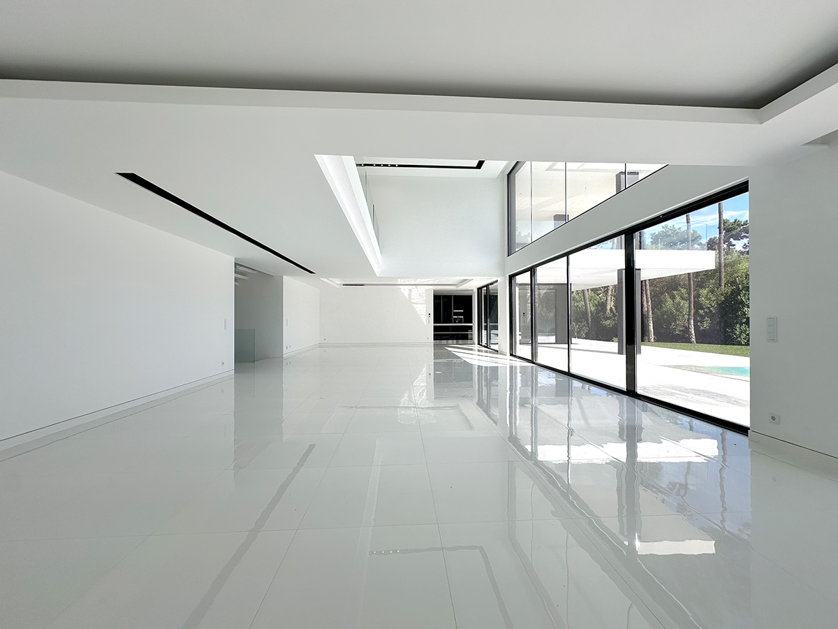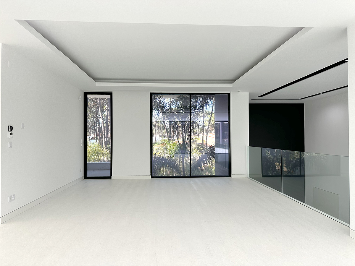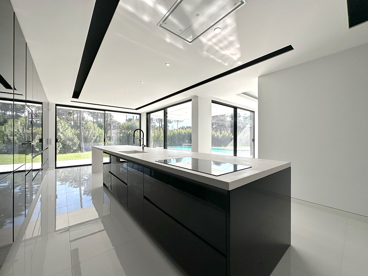 A sala principal, com cerca de 100 m², foi pensada como o centro social da casa, com amplas janelas que promovem luz natural e ligação ao exterior. A cozinha, equipada com eletrodomésticos de última geração e quatro frigoríficos combinados, apresenta um layout funcional e contemporâneo.