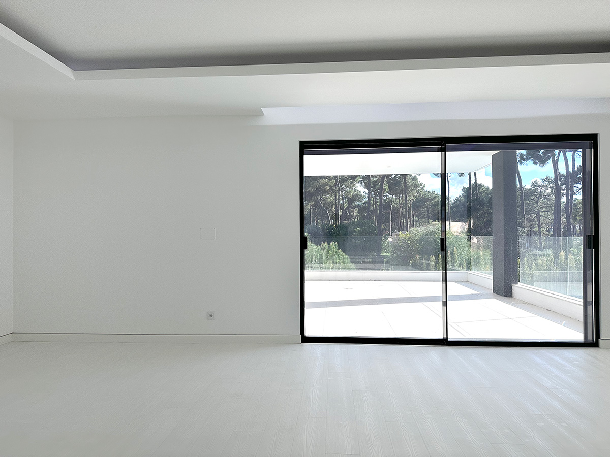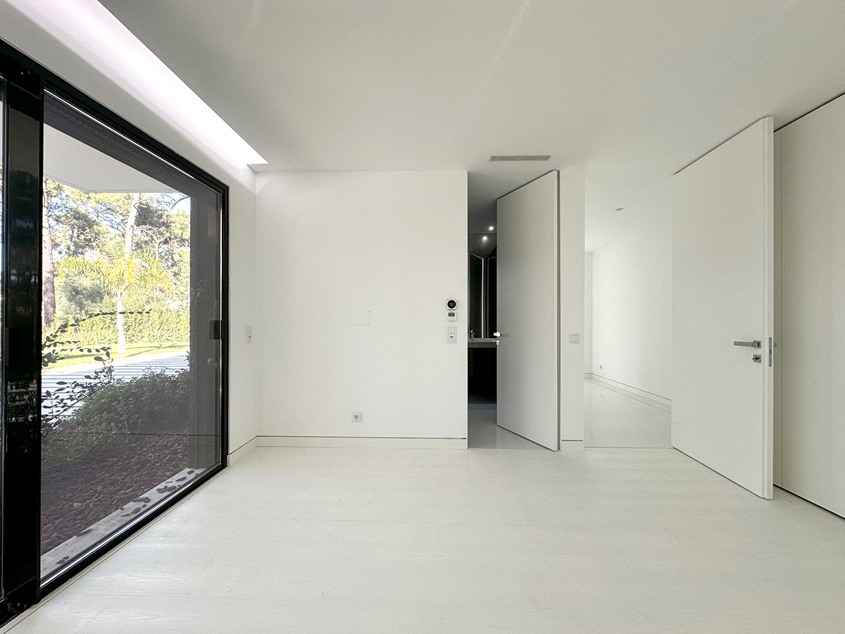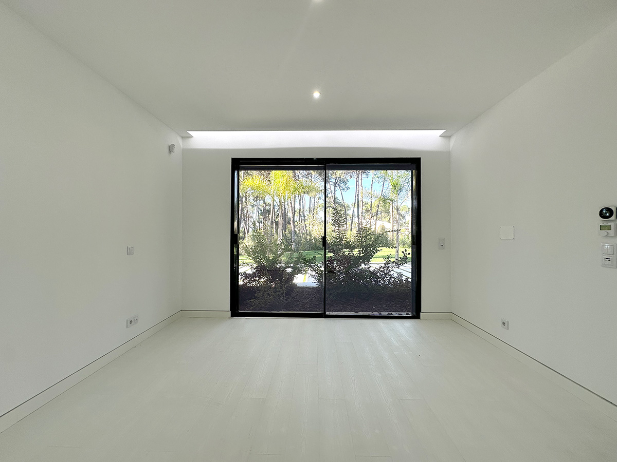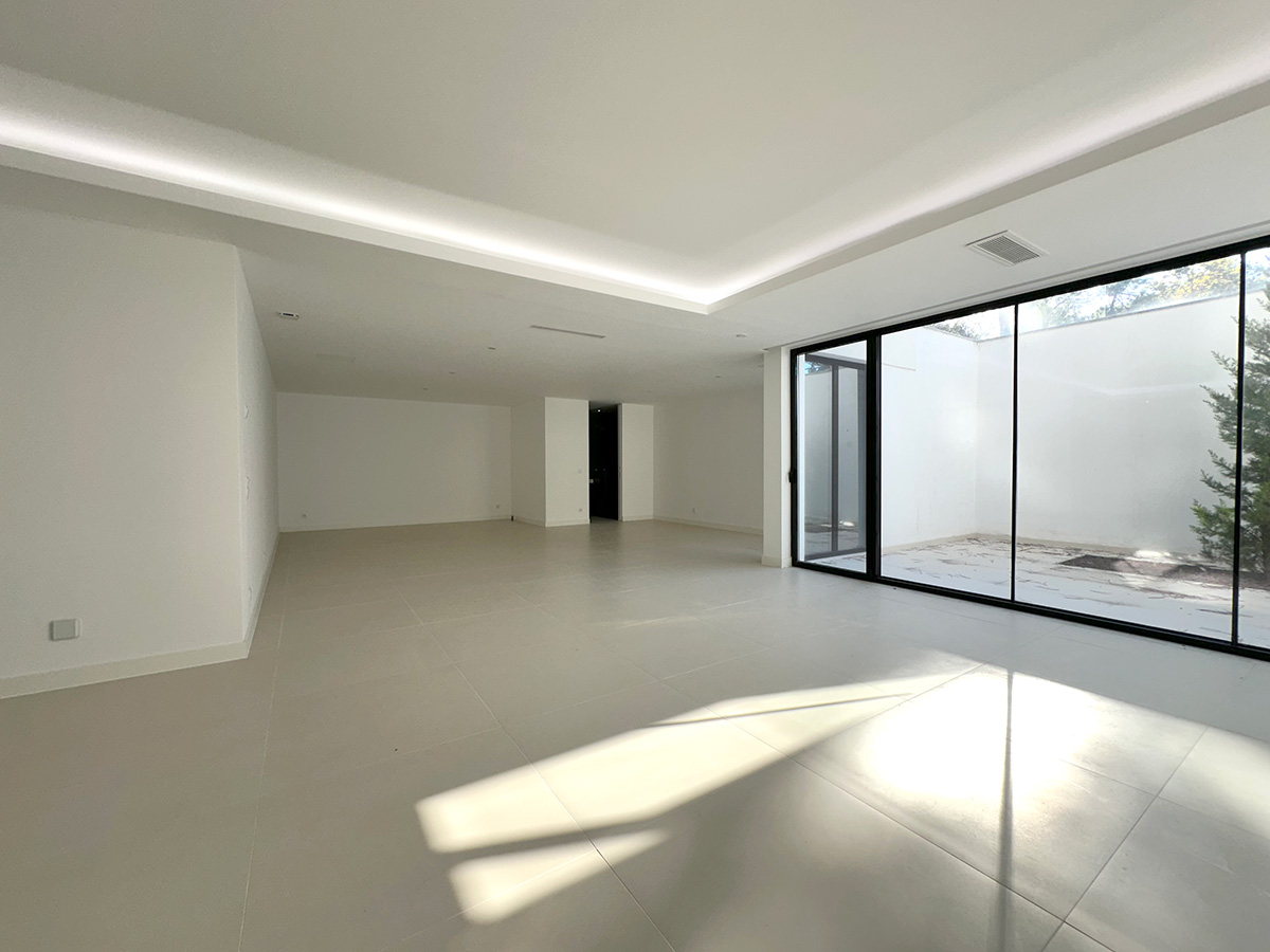 A sala principal, com cerca de 100 m², foi pensada como o centro social da casa, com amplas janelas que promovem luz natural e ligação ao exterior. A cozinha, equipada com eletrodomésticos de última geração e quatro frigoríficos combinados, apresenta um layout funcional e contemporâneo.