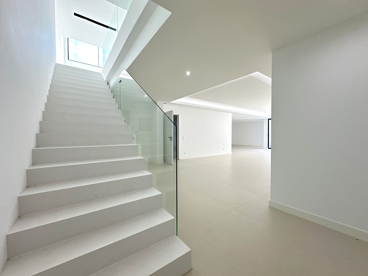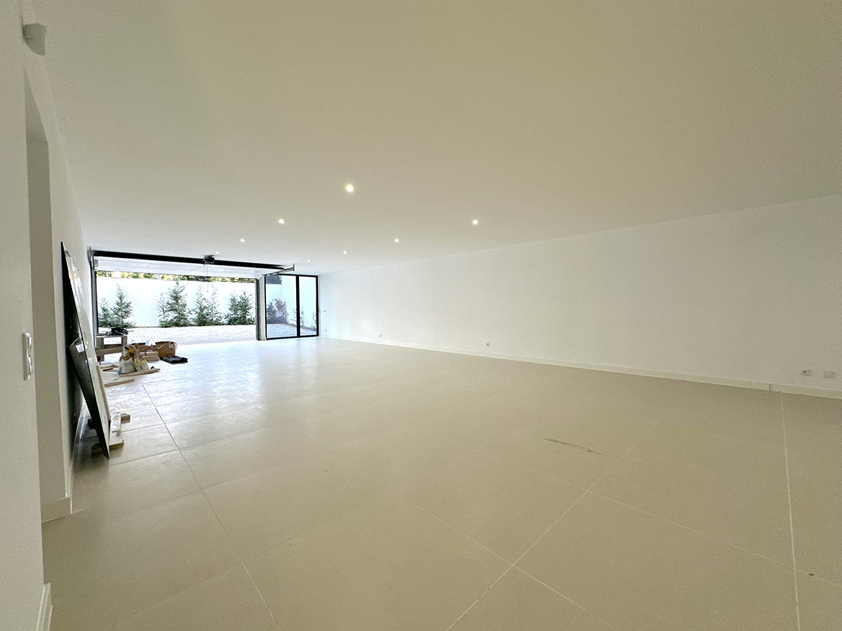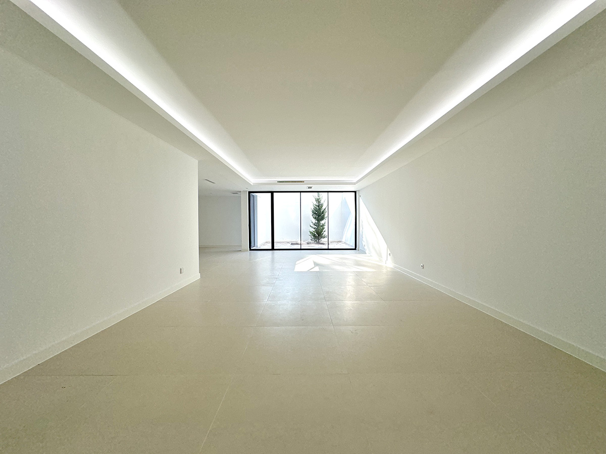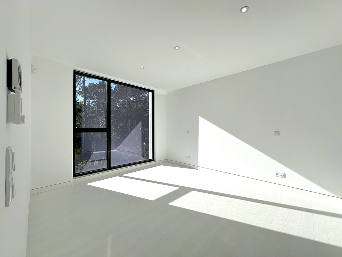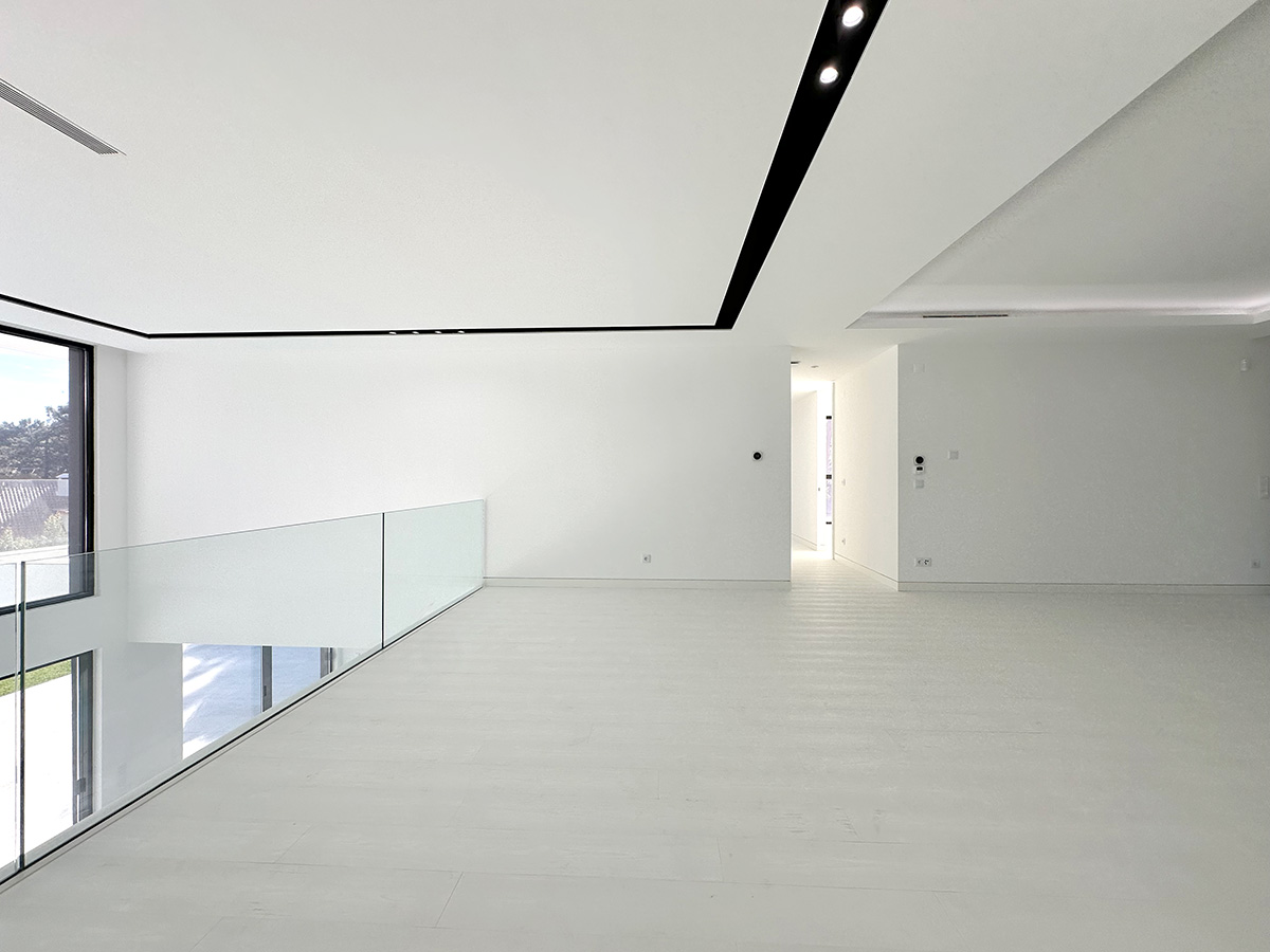 A sala principal, com cerca de 100 m², foi pensada como o centro social da casa, com amplas janelas que promovem luz natural e ligação ao exterior. A cozinha, equipada com eletrodomésticos de última geração e quatro frigoríficos combinados, apresenta um layout funcional e contemporâneo.