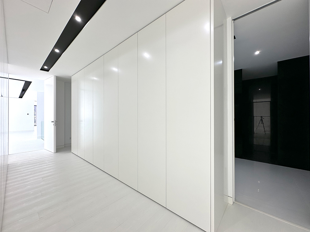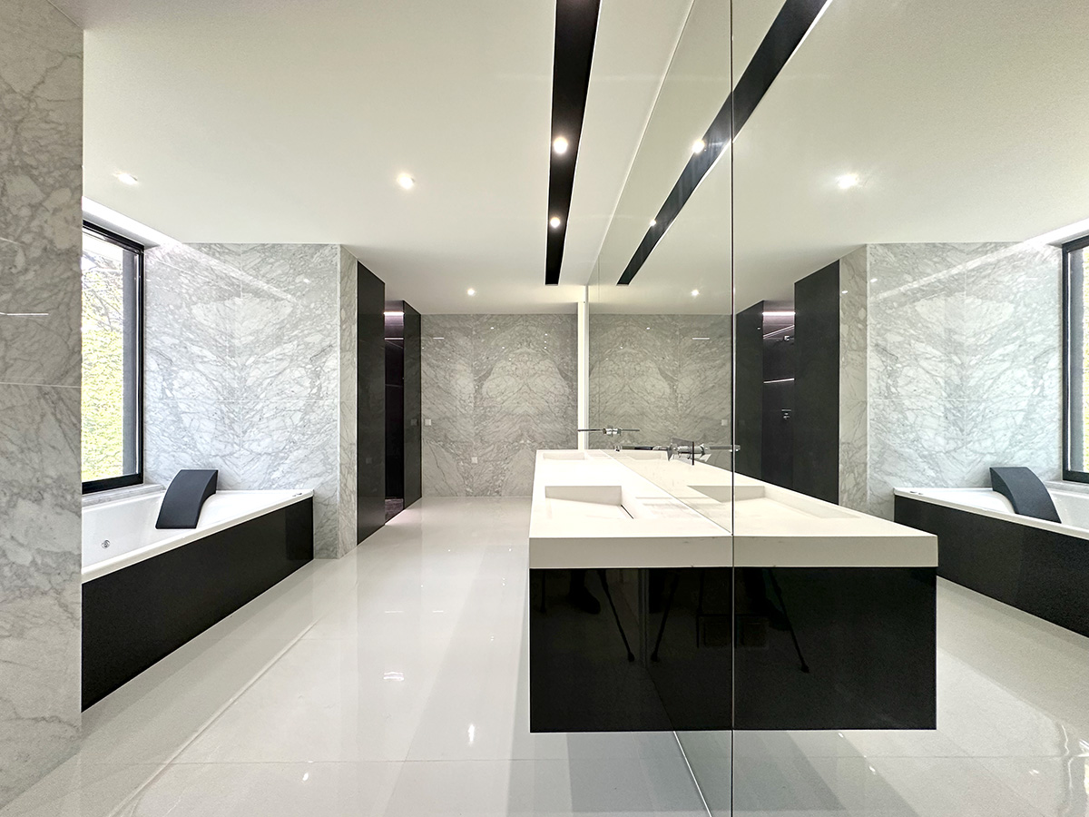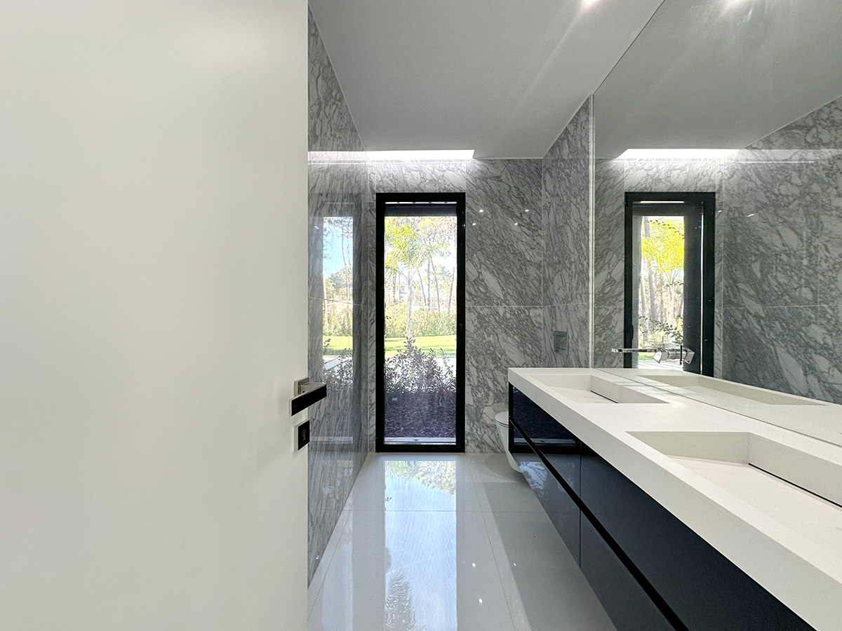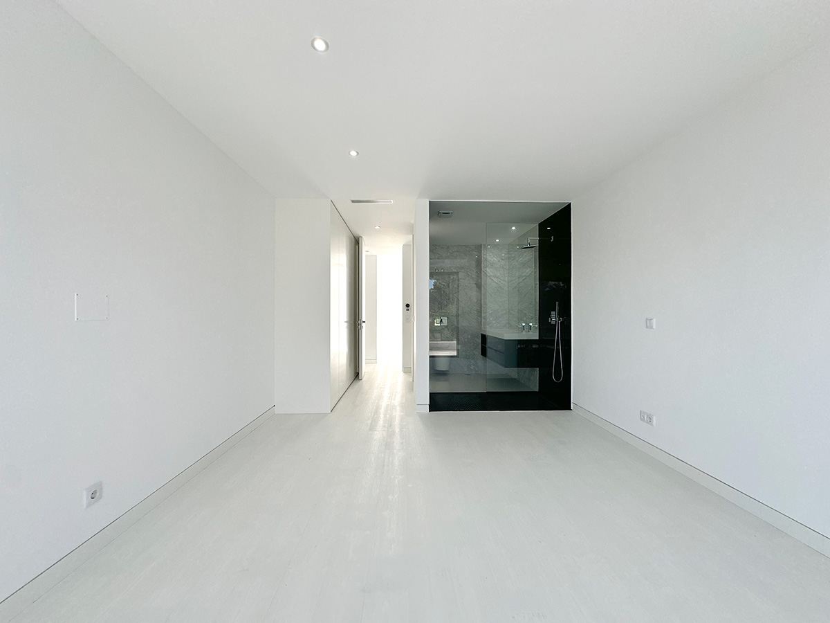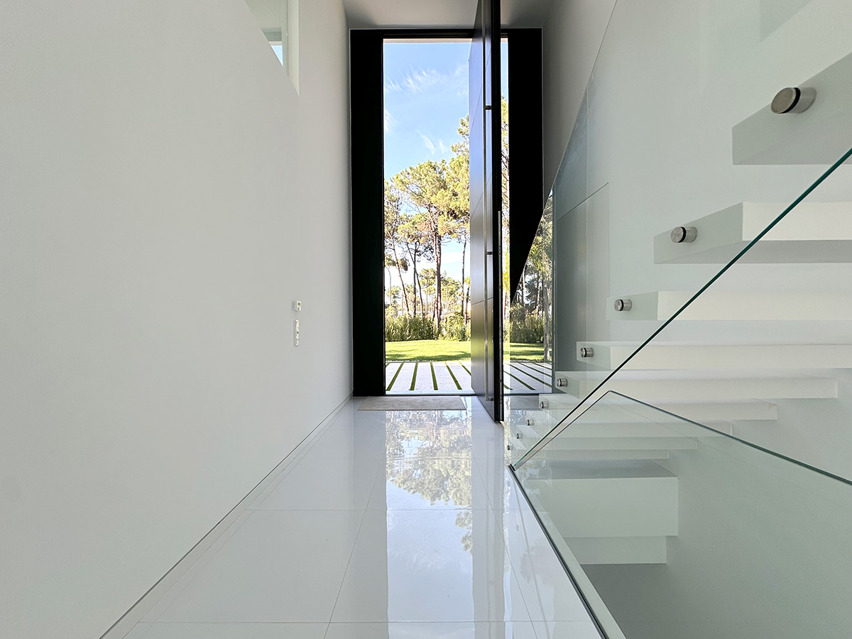 A residência é composta por seis suítes, todas com áreas generosas e acabamentos de qualidade, assegurando conforto e privacidade. A entrada principal destaca-se por uma porta de 6 metros de altura, elemento que confere imponência e marca o caráter arquitetónico da moradia.