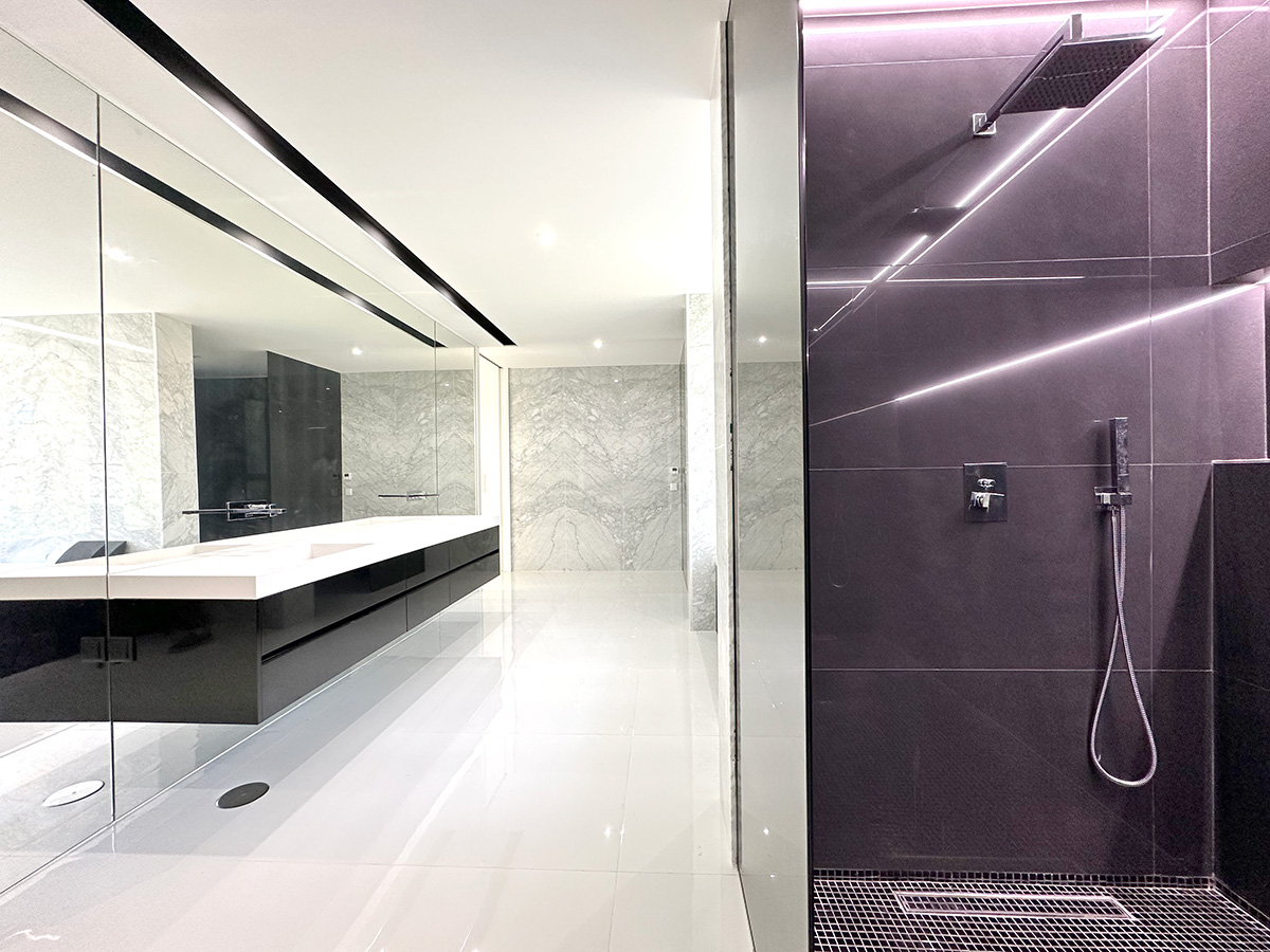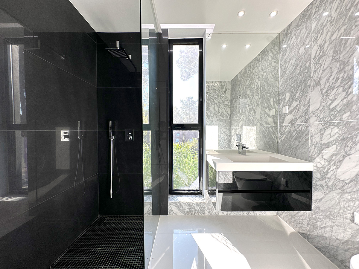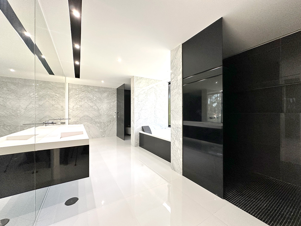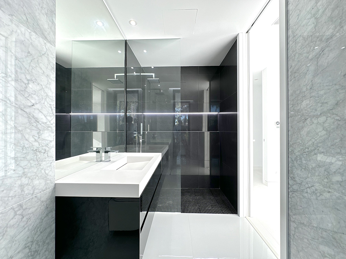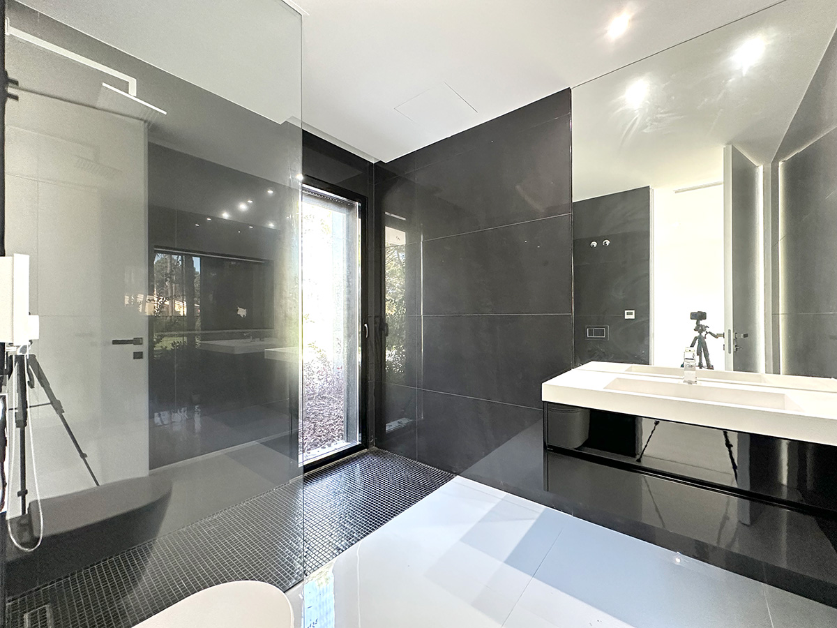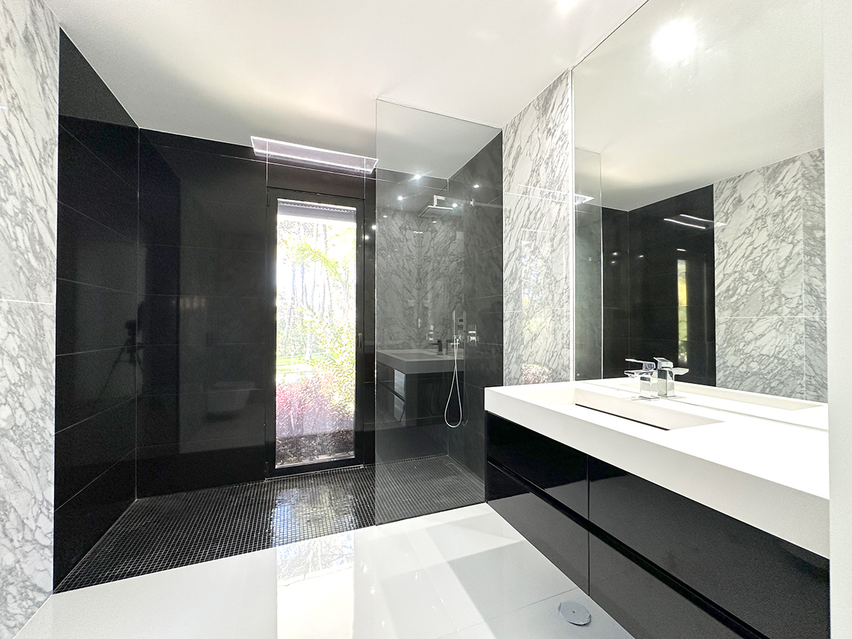 A residência é composta por seis suítes, todas com áreas generosas e acabamentos de qualidade, assegurando conforto e privacidade. A entrada principal destaca-se por uma porta de 6 metros de altura, elemento que confere imponência e marca o caráter arquitetónico da moradia.