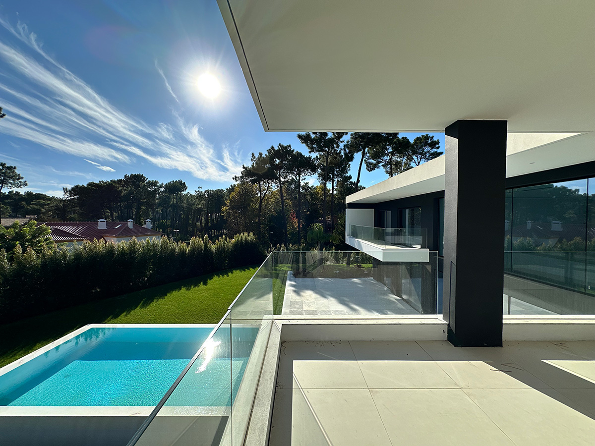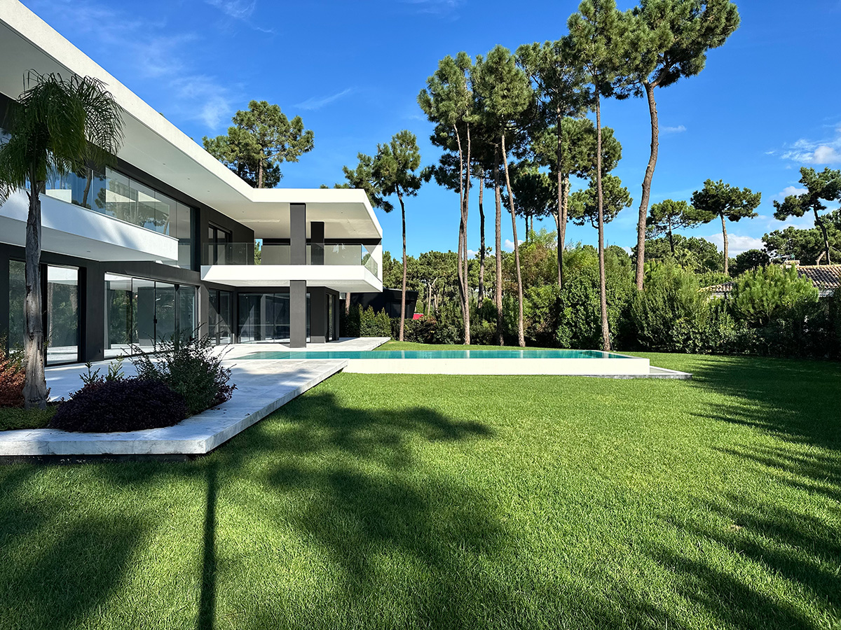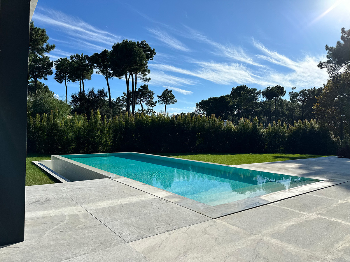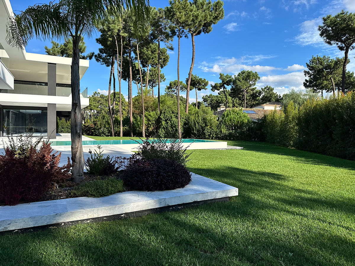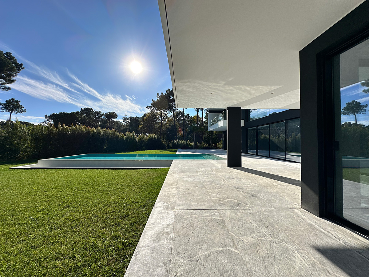 O espaço exterior foi projetado para maximizar o conforto e o lazer. A piscina infinita cria continuidade visual com o jardim e proporciona um ambiente tranquilo. O terreno plano permite múltiplas zonas de descanso, convívio e refeição ao ar livre.