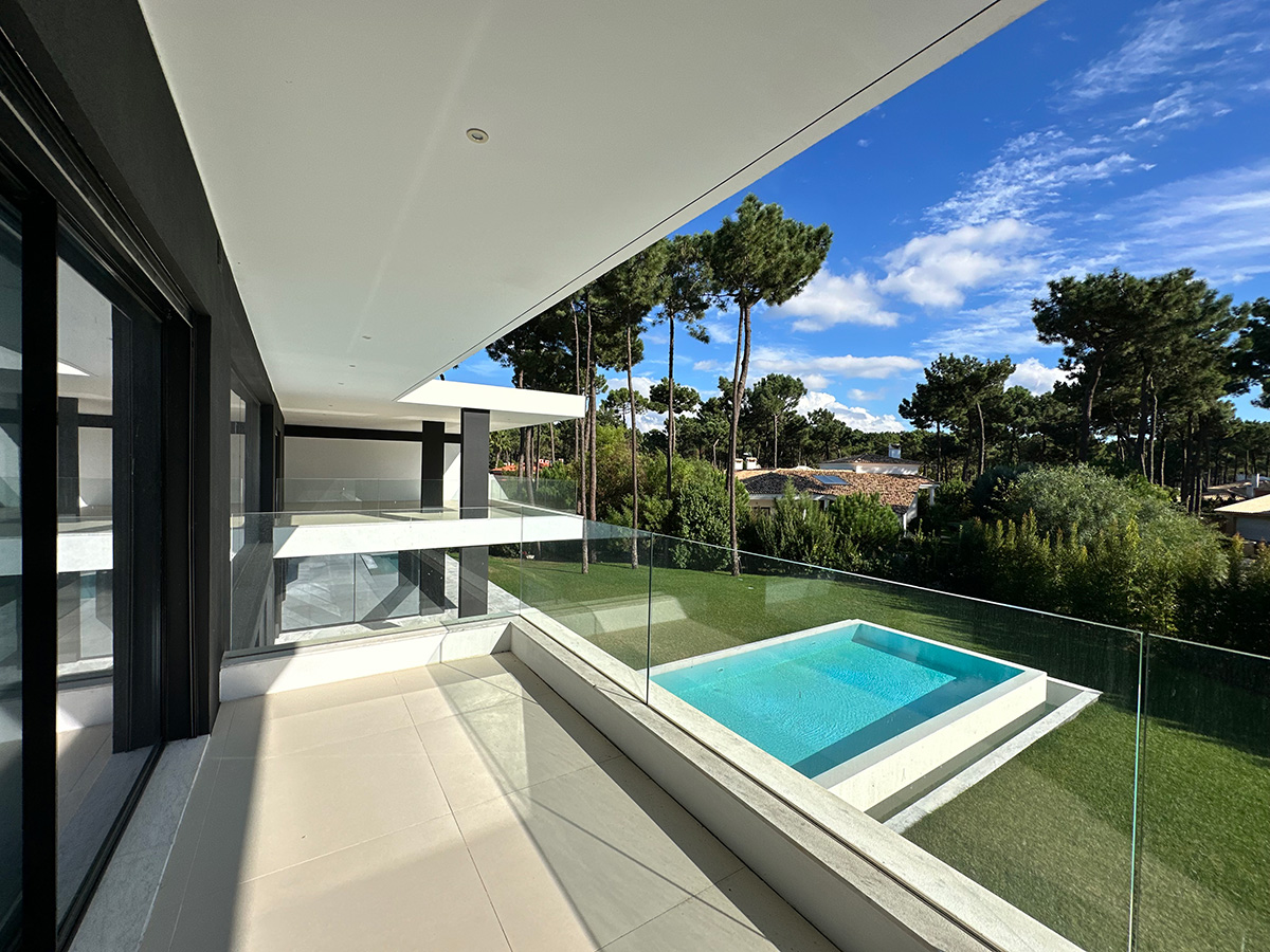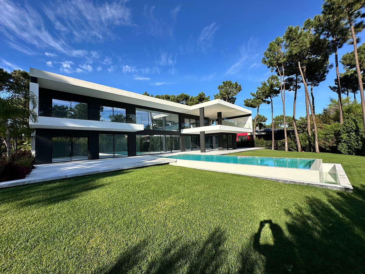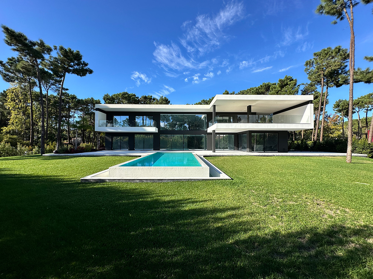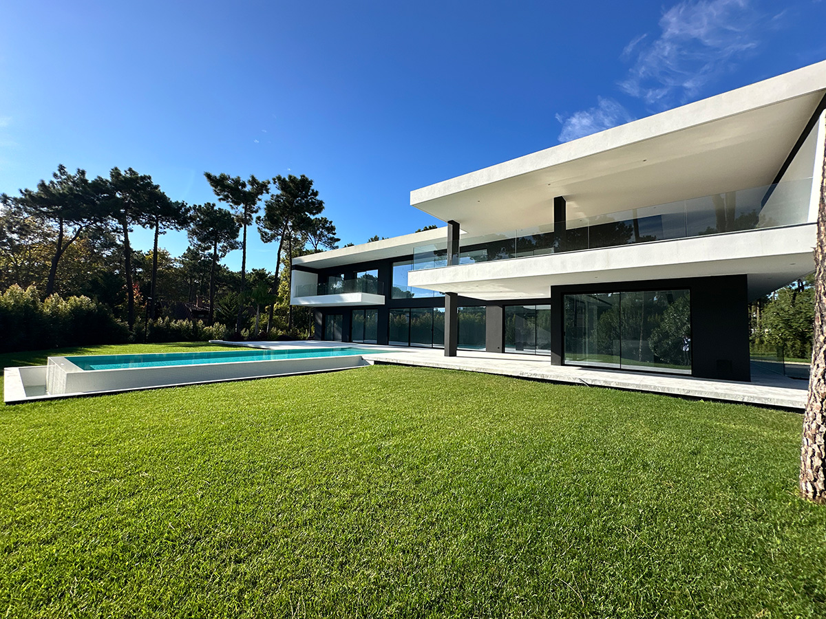 O espaço exterior foi projetado para maximizar o conforto e o lazer. A piscina infinita cria continuidade visual com o jardim e proporciona um ambiente tranquilo. O terreno plano permite múltiplas zonas de descanso, convívio e refeição ao ar livre.