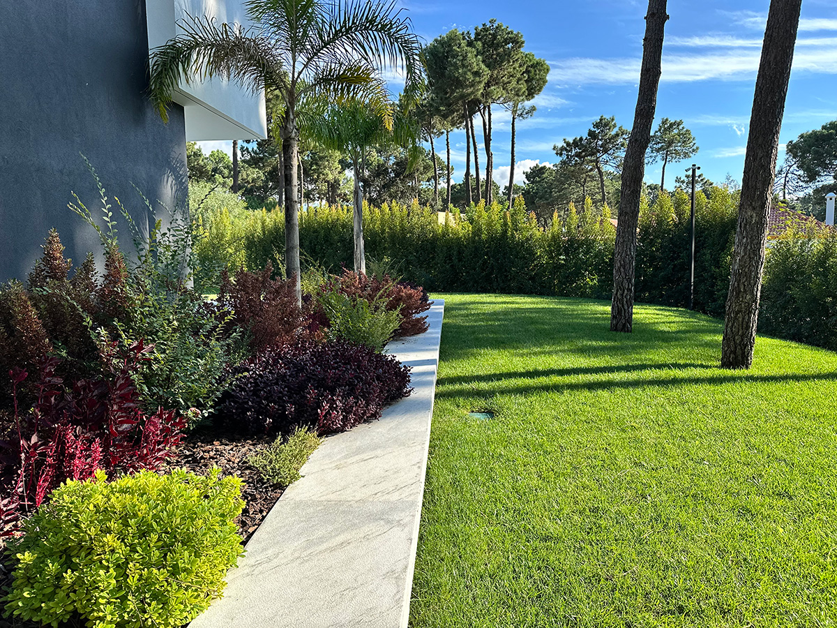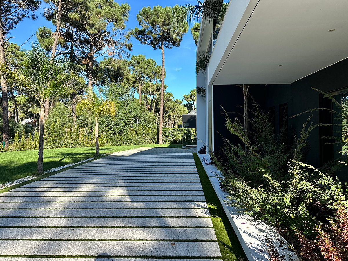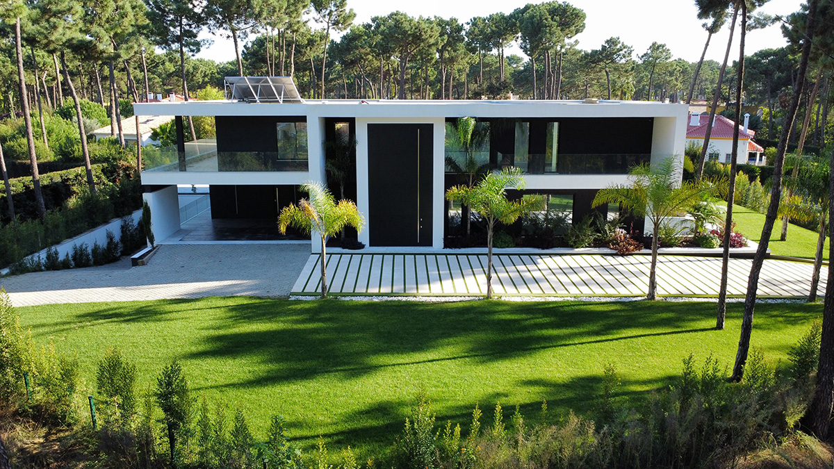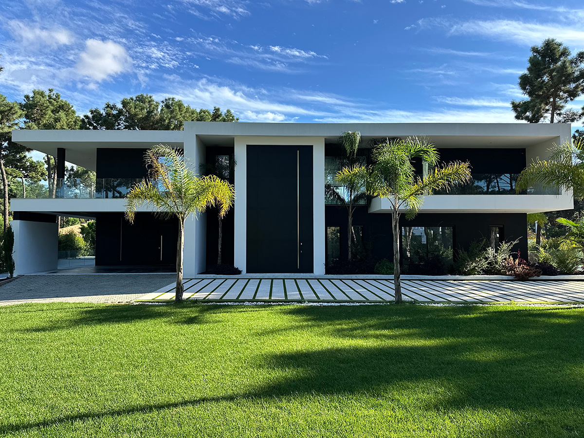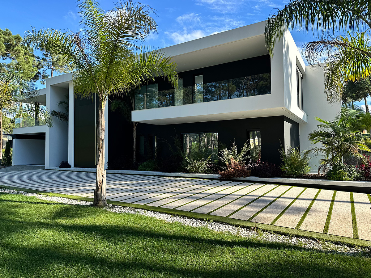 O espaço exterior foi projetado para maximizar o conforto e o lazer. A piscina infinita cria continuidade visual com o jardim e proporciona um ambiente tranquilo. O terreno plano permite múltiplas zonas de descanso, convívio e refeição ao ar livre.