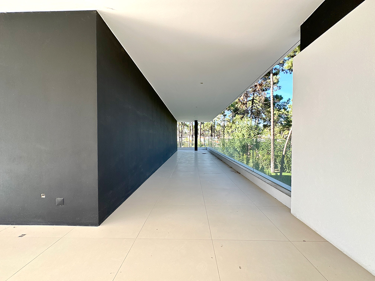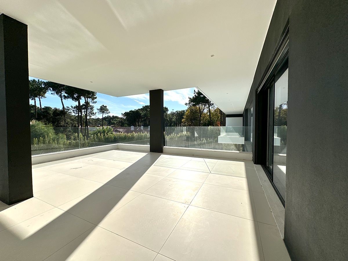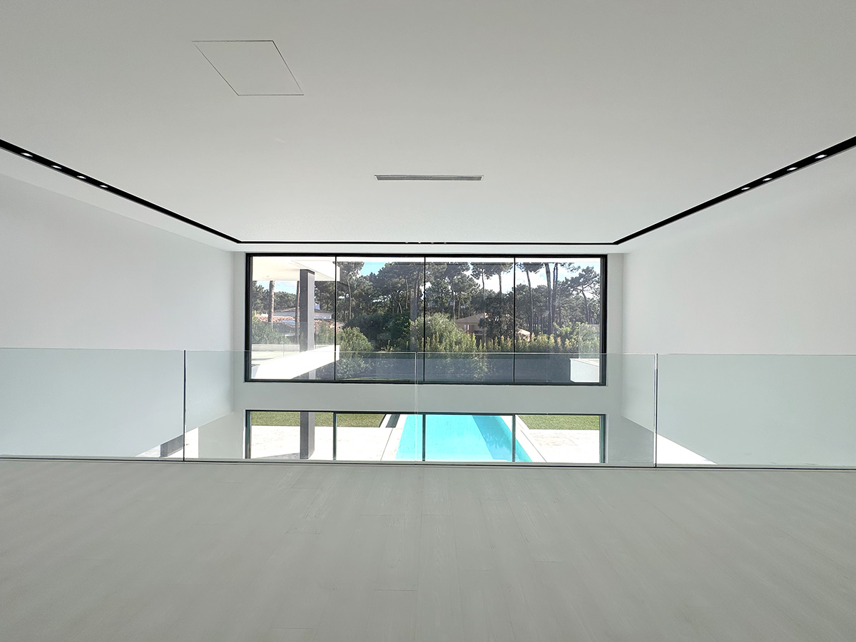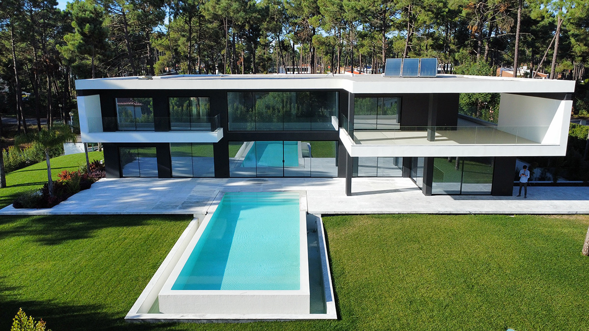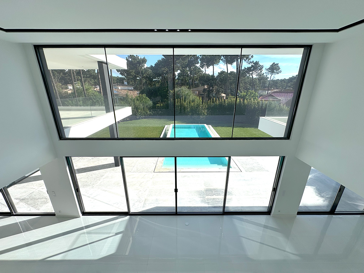 O espaço exterior foi projetado para maximizar o conforto e o lazer. A piscina infinita cria continuidade visual com o jardim e proporciona um ambiente tranquilo. O terreno plano permite múltiplas zonas de descanso, convívio e refeição ao ar livre.