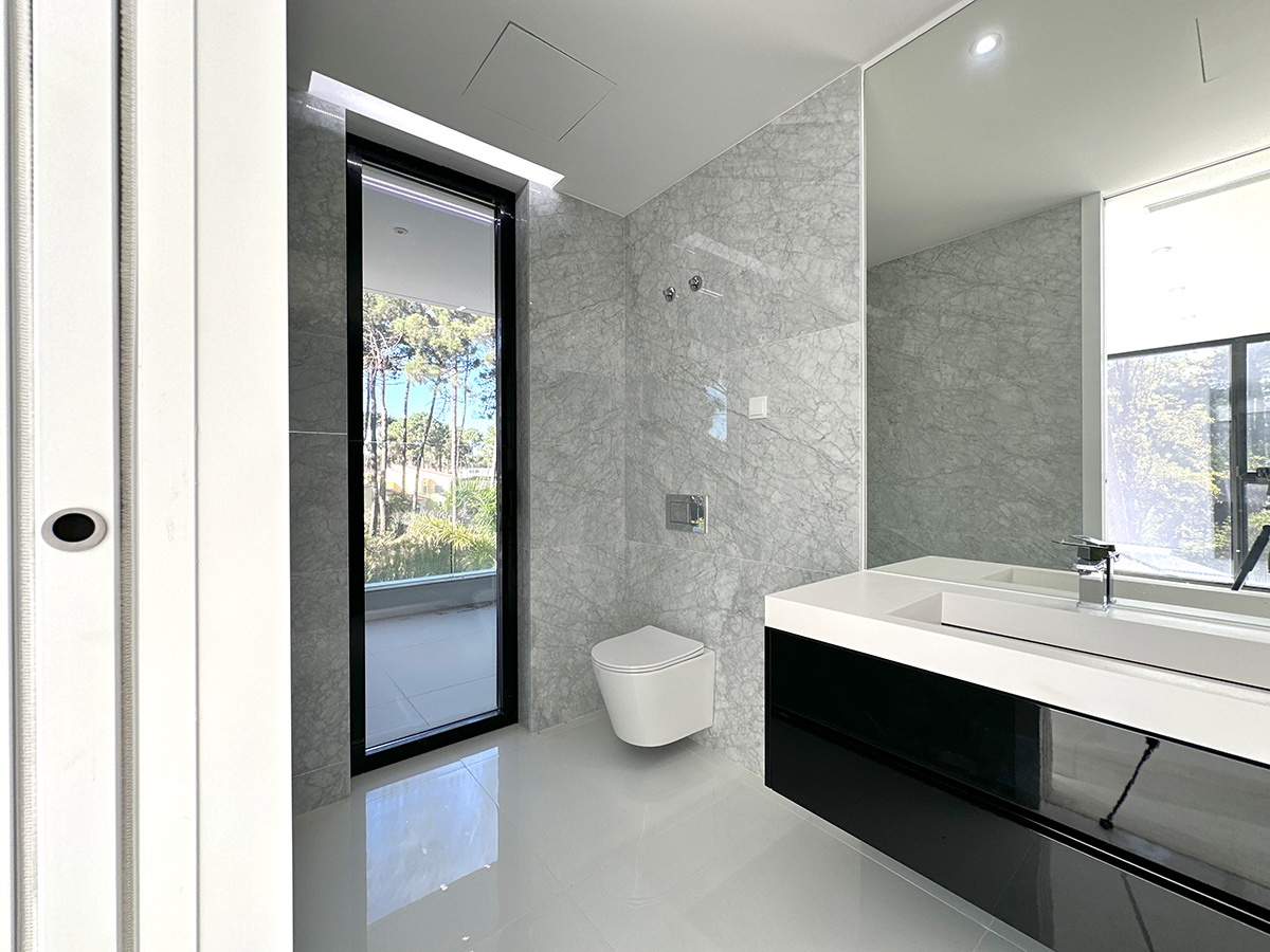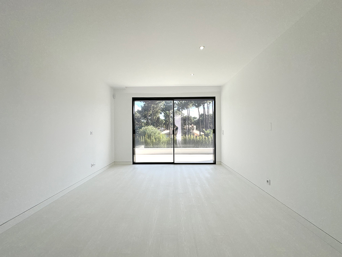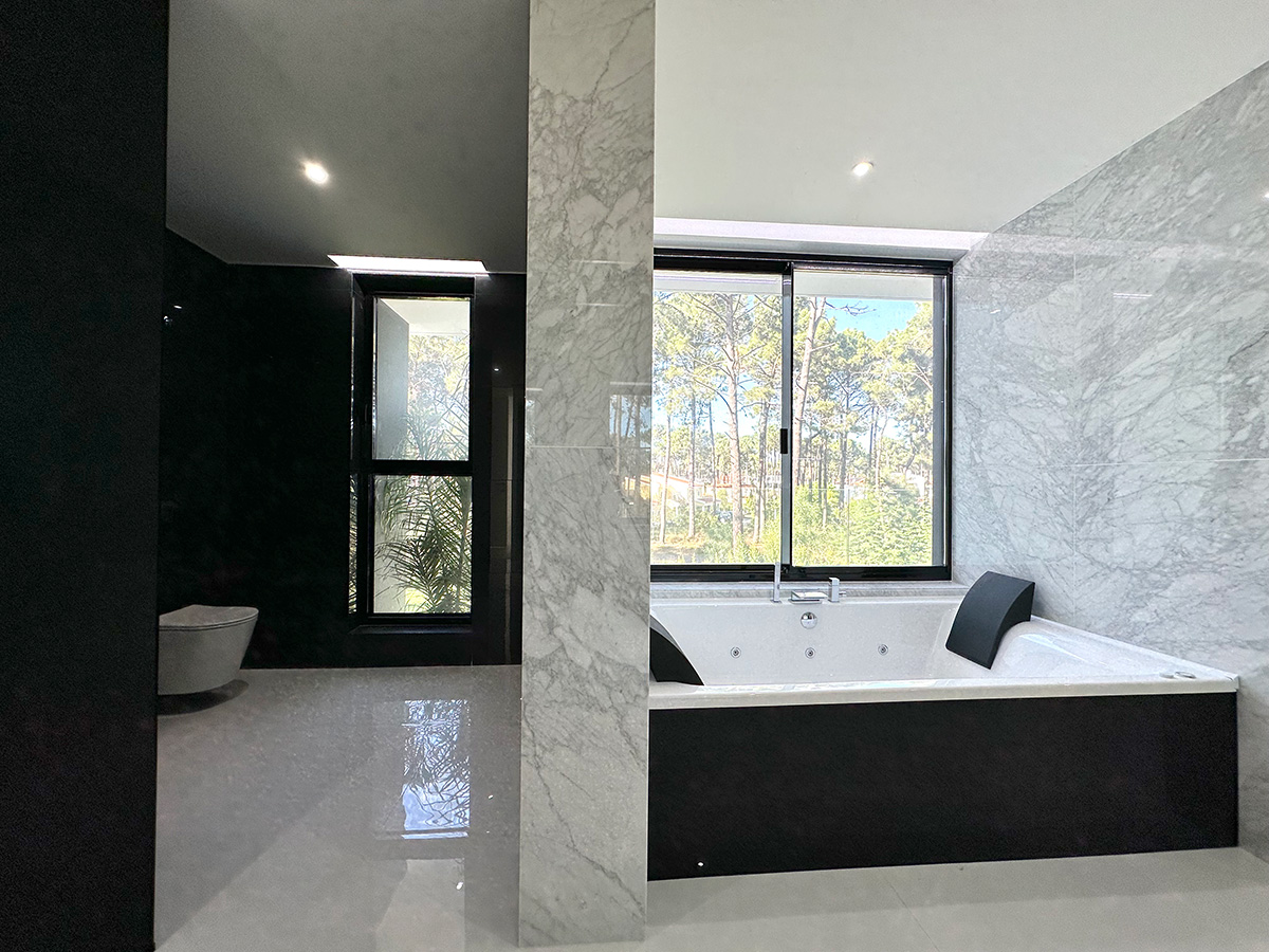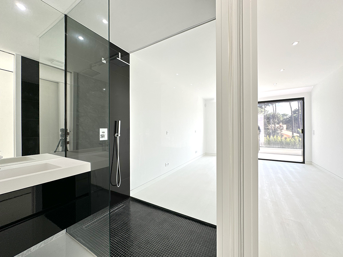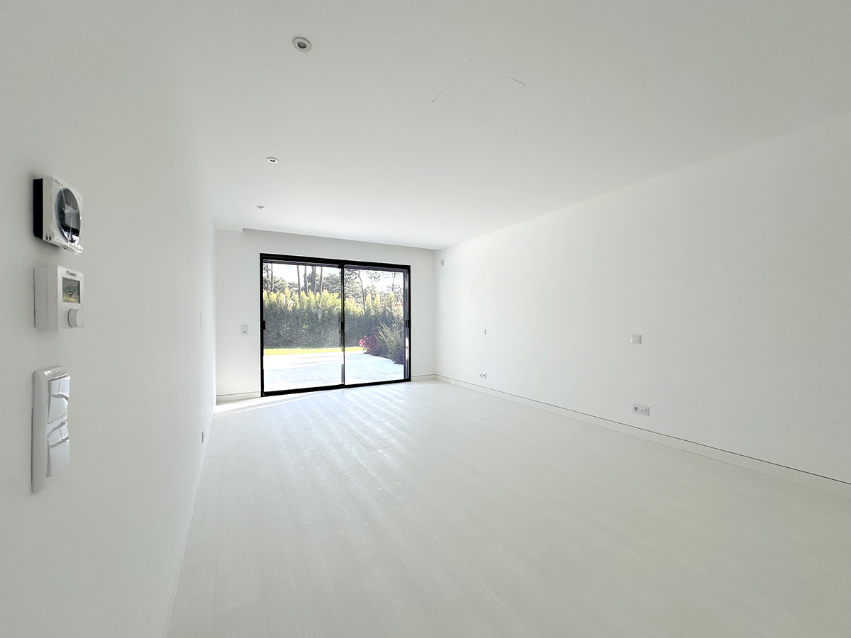 O espaço exterior foi projetado para maximizar o conforto e o lazer. A piscina infinita cria continuidade visual com o jardim e proporciona um ambiente tranquilo. O terreno plano permite múltiplas zonas de descanso, convívio e refeição ao ar livre.